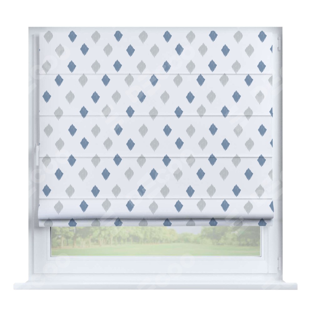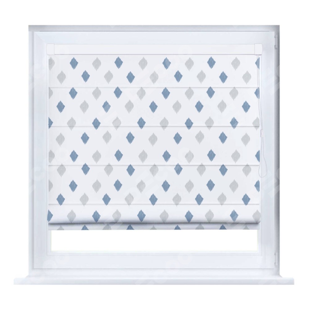 Римская штора производителя «Cortin», устанавливается на створку окна, пошита из ткани блэкаут с нанесением сублимационной печати «Икат ромбики». Штора шьётся по индивидуальным размерам, для данного типа римской шторы возможная ширина от 35 до 150 см., высота до 250 см.