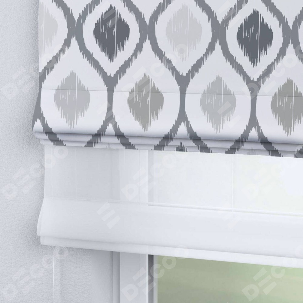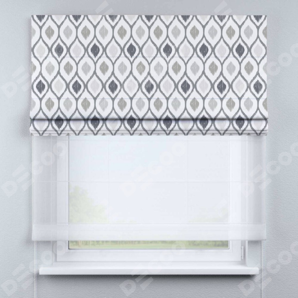 Двойная римская штора «День-ночь» от производителя Cortin предназначена для использования в проёмах. Эта штора уникальна тем, что состоит из двух полотен. На лицевой стороне находится блэкаут с нанесением сублимационной печати «Мечта востока серый», обеспечивающий эффективное затемнение. В комплект также входит вторая ткань — легкий белый тюль (артикул: V-01), который добавляет изящества и легкости оформлению окна. Кроме того, доступны и другие разновидности ткани тюль, выбор которых доступен по  ссылке .