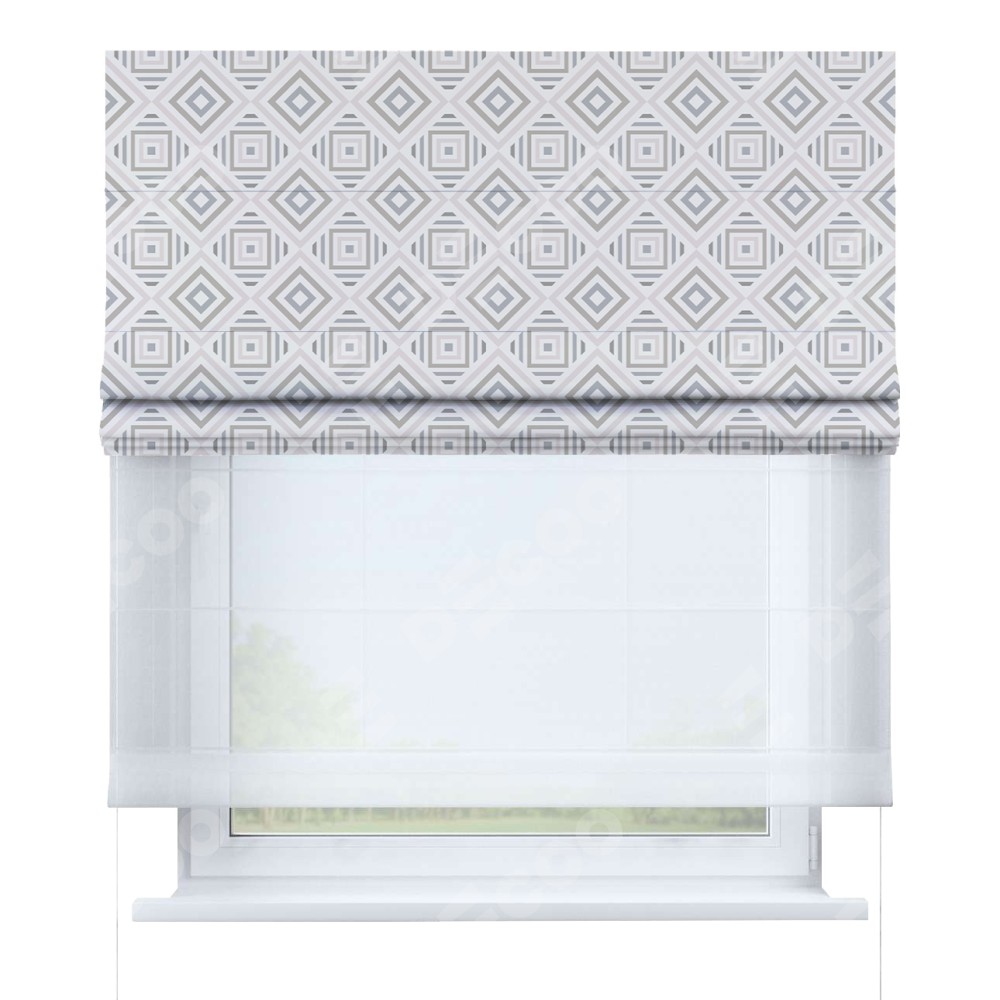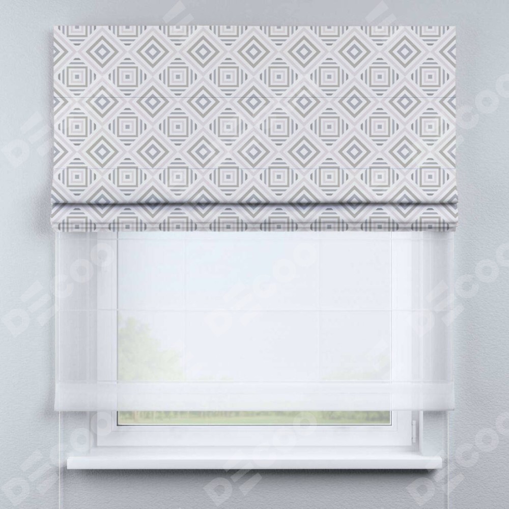 Двойная римская штора «День-ночь» от производителя Cortin предназначена для использования в проёмах. Эта штора уникальна тем, что состоит из двух полотен. На лицевой стороне находится блэкаут с нанесением сублимационной печати «Техно серый», обеспечивающий эффективное затемнение. В комплект также входит вторая ткань — легкий белый тюль (артикул: V-01), который добавляет изящества и легкости оформлению окна. Кроме того, доступны и другие разновидности ткани тюль, выбор которых доступен по  ссылке .