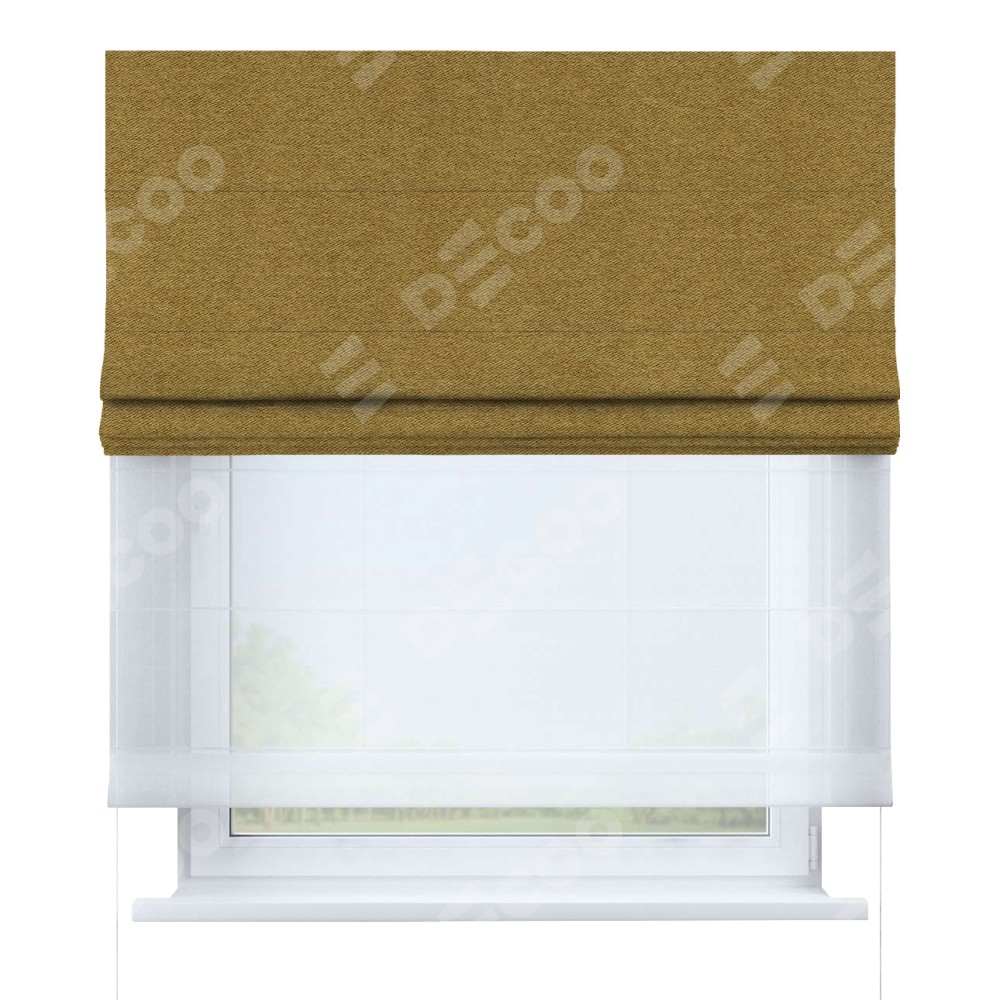 Двойная римская штора «День-ночь» от производителя Cortin предназначена для использования в проёмах. Эта штора уникальна тем, что состоит из двух полотен. На лицевой стороне находится твид блэкаут горчица (артикул: 91237), обеспечивающий эффективное затемнение. В комплект также входит вторая ткань — легкий белый тюль (артикул: V-01), который добавляет изящества и легкости оформлению окна. Кроме того, доступны и другие разновидности ткани тюль, выбор которых доступен по  ссылке .