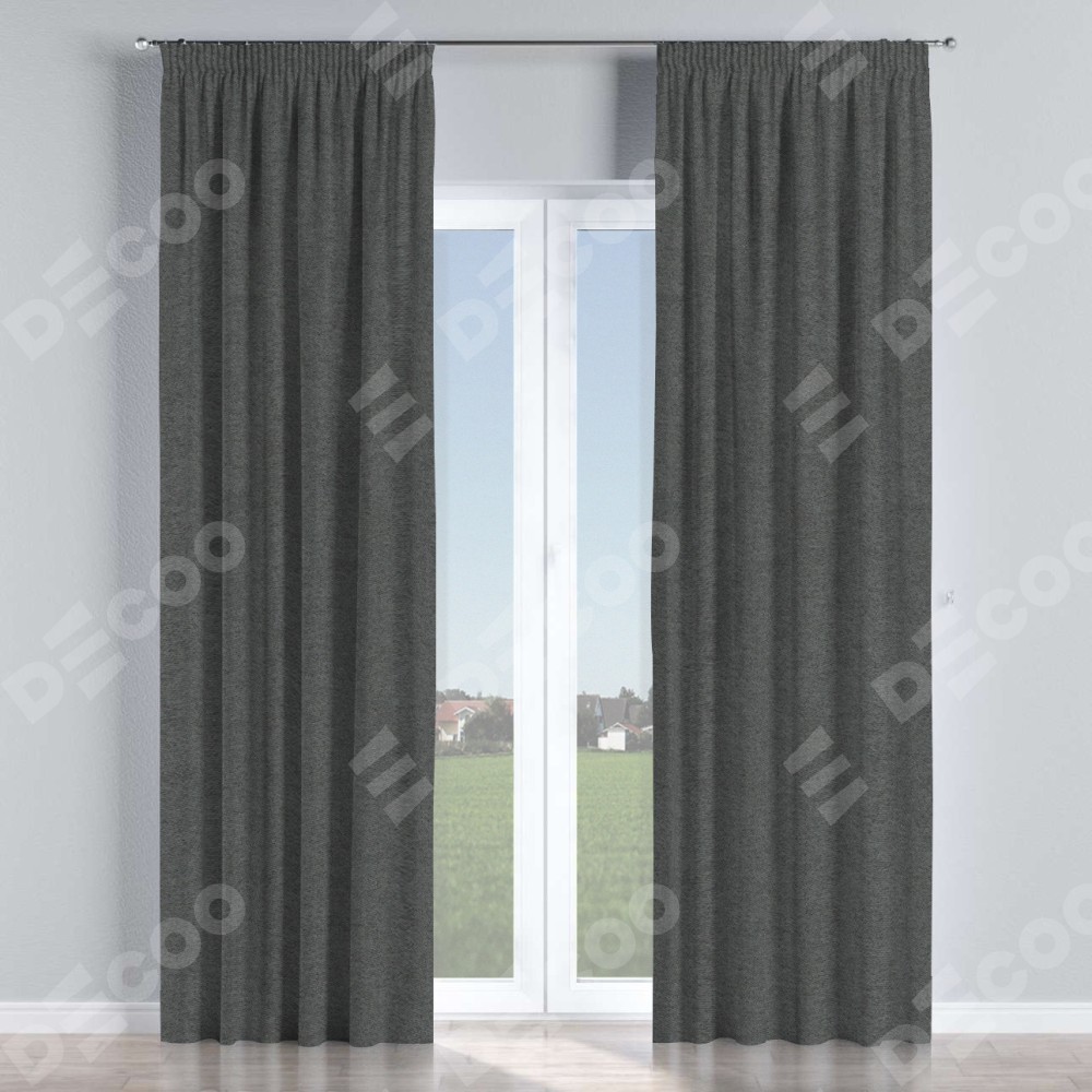 Комплект прямых штор, от производителя «Cortin», пошиты из ткани твид блэкаут тёмно-серый, артикул ткани 90938. С изнаночной стороны в верхней части штор пристрачивается шторная лента с декоративными складками «Карандаш». Для создания элегантных складок прямые шторы шьются по стандарту с коэффициентом 1:2 (на 100 см. ширины проёма 200 см. ширины ткани).