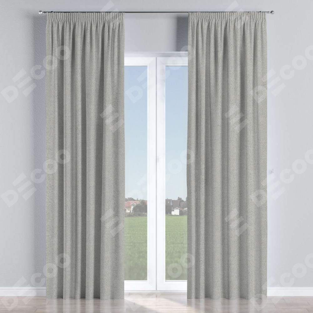 Комплект прямых штор, от производителя «Cortin», пошиты из ткани твид блэкаут светло-серый, артикул ткани 90936. С изнаночной стороны в верхней части штор пристрачивается шторная лента с декоративными складками «Карандаш». Для создания элегантных складок прямые шторы шьются по стандарту с коэффициентом 1:2 (на 100 см. ширины проёма 200 см. ширины ткани).
