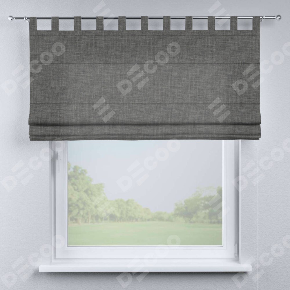 Римская штора производителя «Cortin», используется для проёма, пошита из ткани лён тёмно-серый, артикул ткани 7441. Данная модель пошита на петлях, комплектуется на выбор круглым карнизом и подходит для монтажа на стену. Римская штора на петлях имеет простую систему регулировки высоты, отличительным преимуществом данной модели является простой способ монтажа. Достаточно повесить ее на трубу и штора готова!