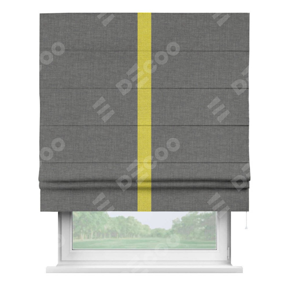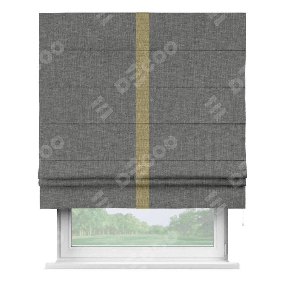 Римская штора производителя «Cortin», используется для проёма, пошита из ткани лён тёмно-серый, артикул 7441. Отделка шторы кантом «Хайвэй», ткань для канта используется из льна разной расцветки на выбор. Имеет универсальный механизм и подходит для монтажа: на потолок, на стену и в нишу.