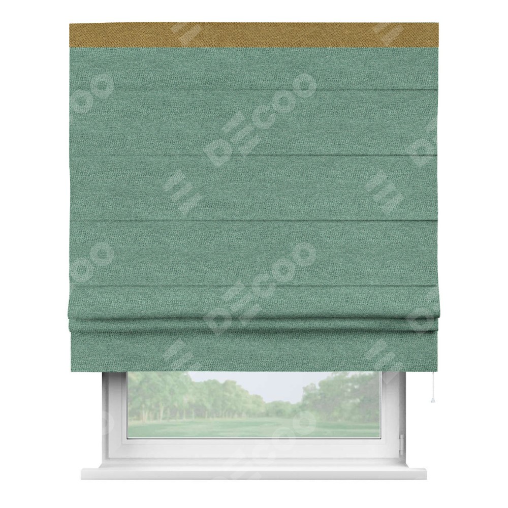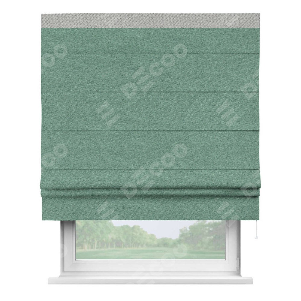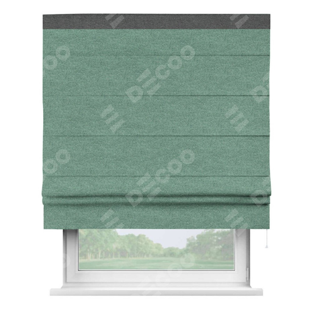 Римская штора производителя «Cortin», используется для проёма, пошита из ткани твид блэкаут бирюзовый, артикул 90934. Отделка шторы кантом «Кинг», ткань для канта используется из твида разной расцветки на выбор. Имеет универсальный механизм и подходит для монтажа: на потолок, на стену и в нишу.