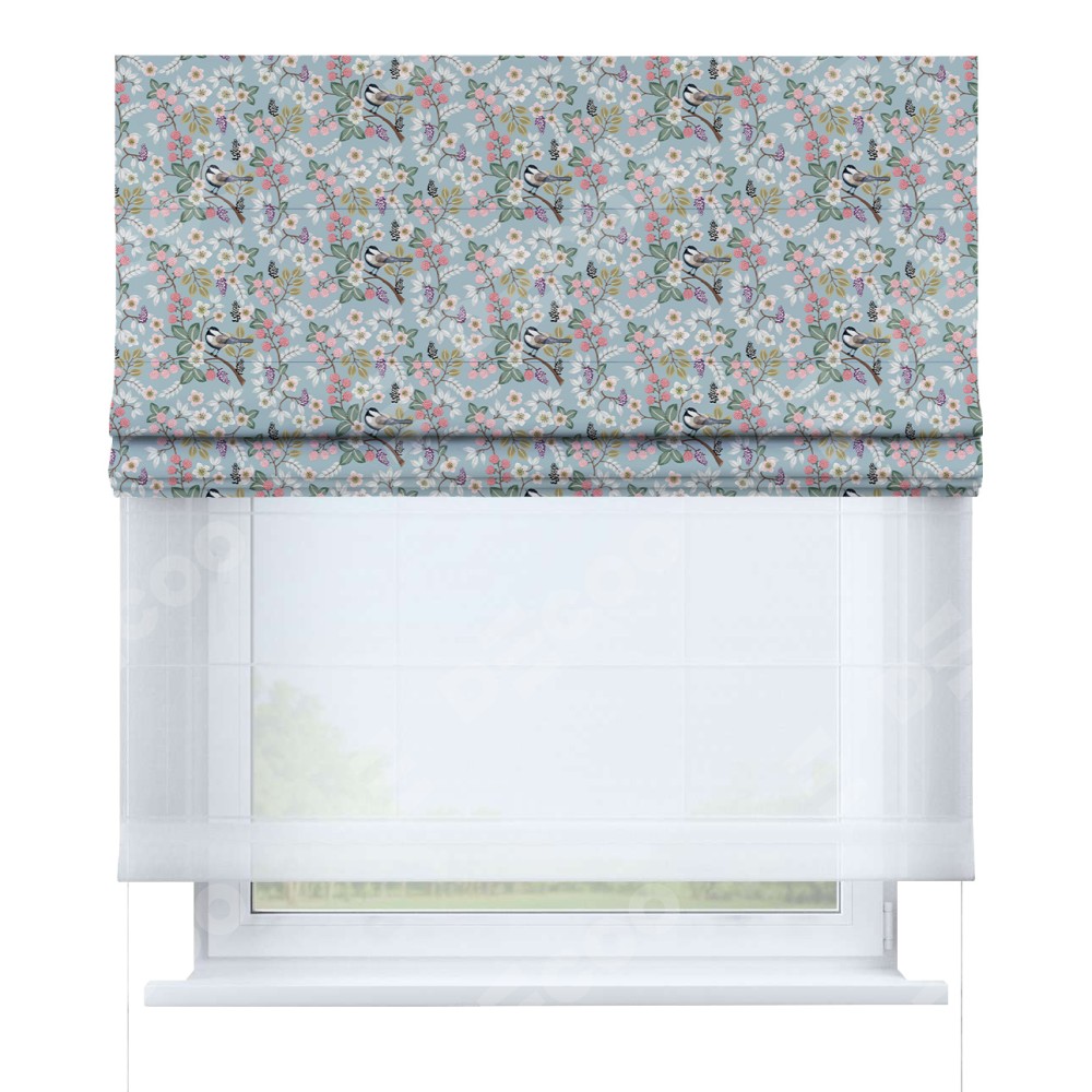 Двойная римская штора «День-ночь» от производителя Cortin предназначена для использования в проёмах. Эта штора уникальна тем, что состоит из двух полотен. На лицевой стороне находится блэкаут с нанесением сублимационной печати «Ежевичное утро», обеспечивающий эффективное затемнение. В комплект также входит вторая ткань — легкий белый тюль (артикул: V-01), который добавляет изящества и легкости оформлению окна. Кроме того, доступны и другие разновидности ткани тюль, выбор которых доступен по ссылке .