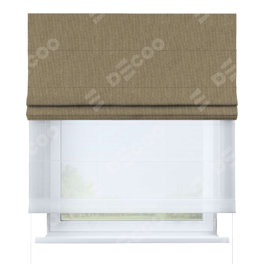 Двойная римская штора «День-ночь» от производителя Cortin предназначена для использования в проёмах. Эта штора уникальна тем, что состоит из двух полотен. На лицевой стороне находится лён димаут тёмно-бежевый (артикул: 16261), обеспечивающий эффективное затемнение. В комплект также входит вторая ткань — легкий белый тюль (артикул: V-01), который добавляет изящества и легкости оформлению окна. Кроме того, доступны и другие разновидности ткани тюль, выбор которых доступен по ссылке .
