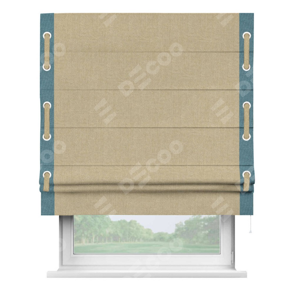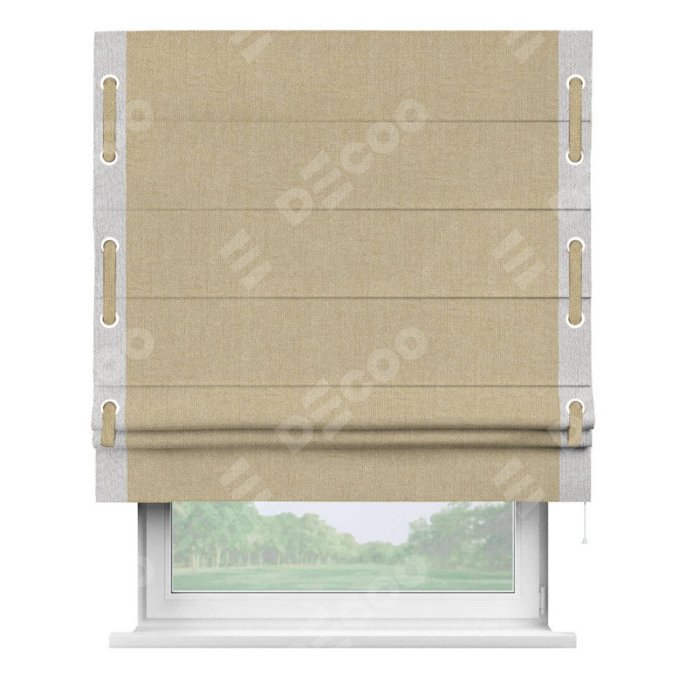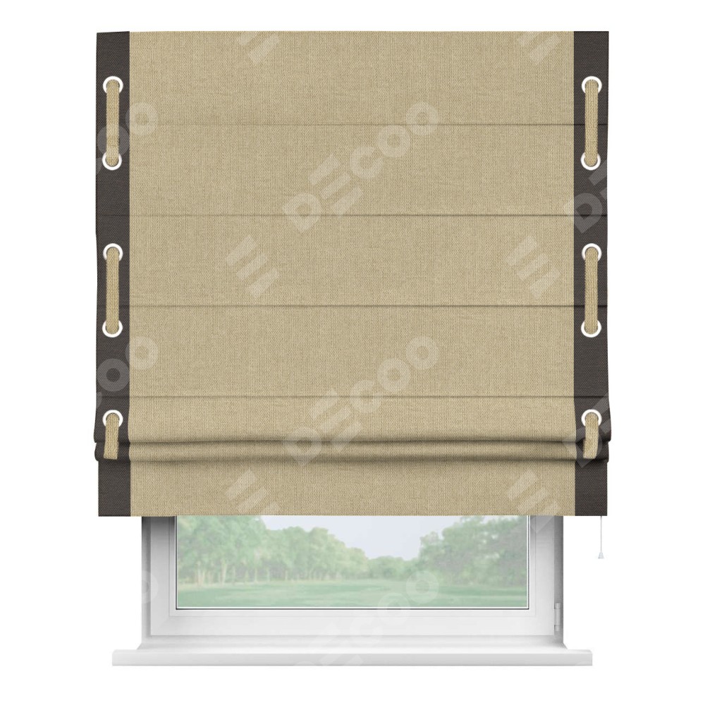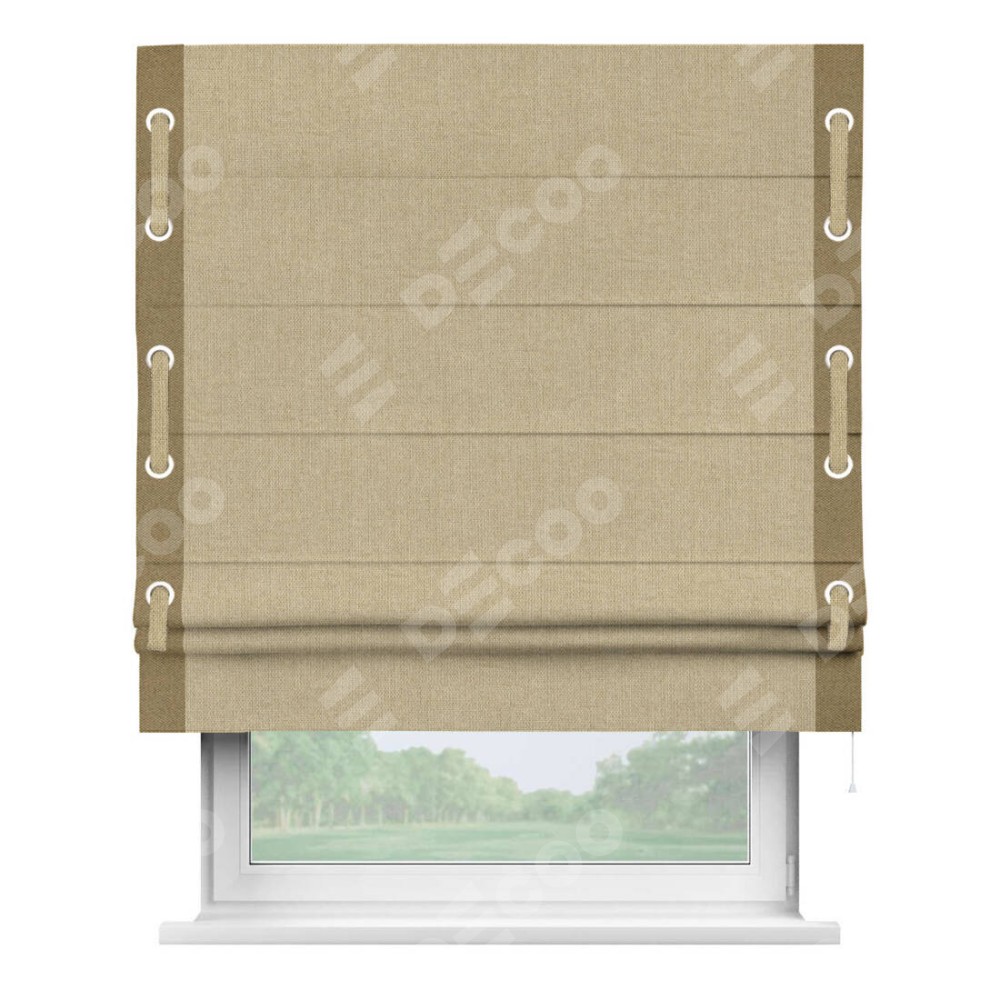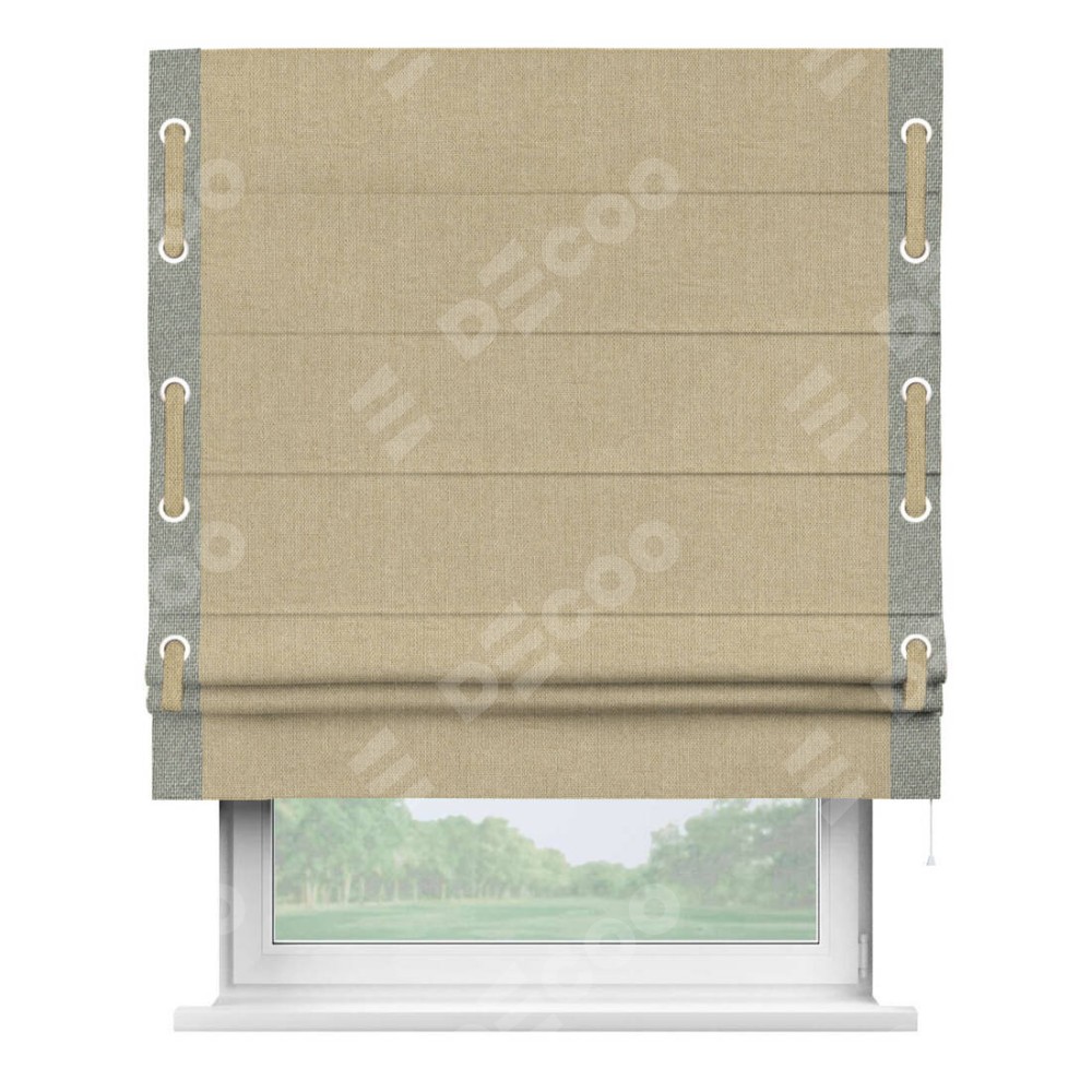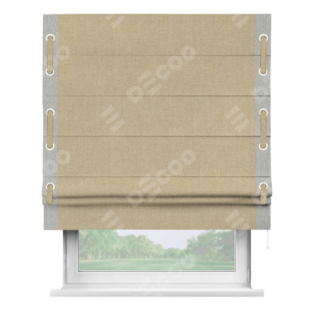 Римская штора «Кортин» для проема, лён димаут песочный с кантом Стрим Дуо (люверсы с пояском)