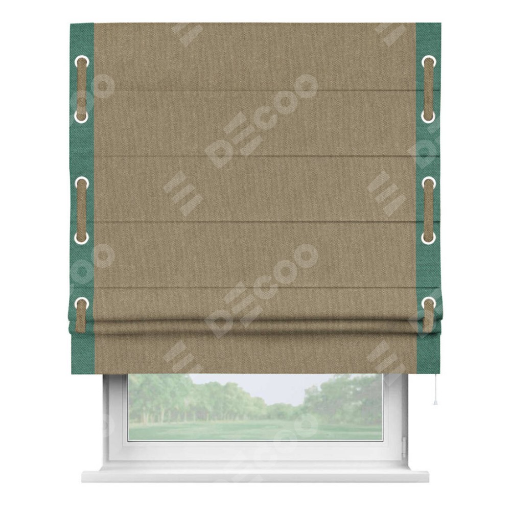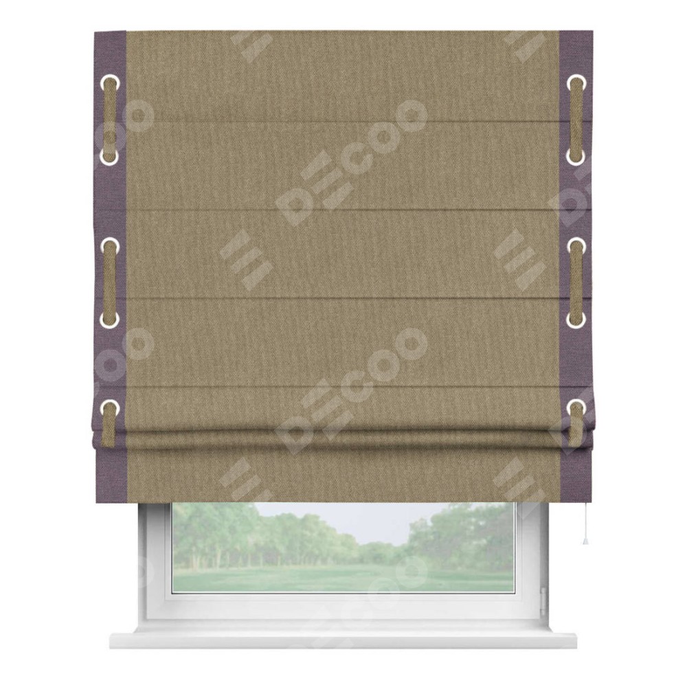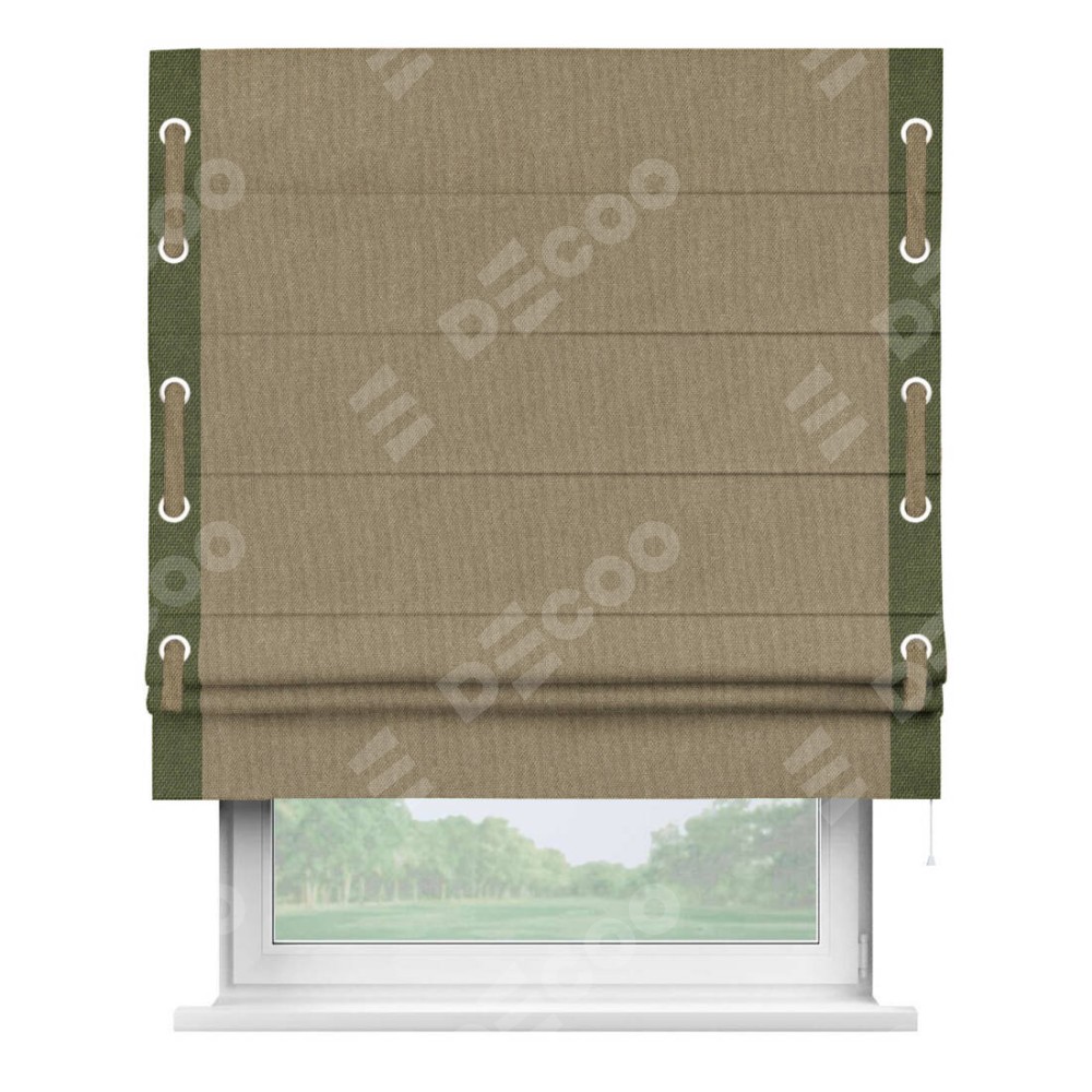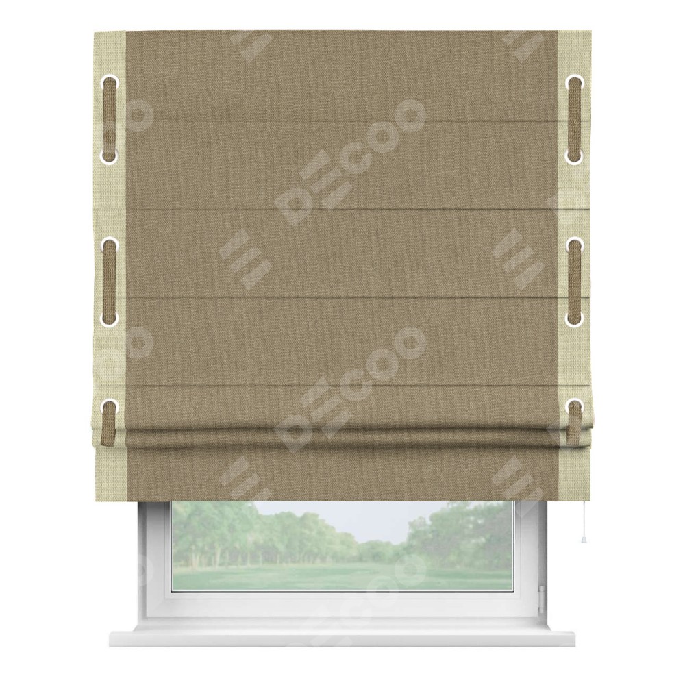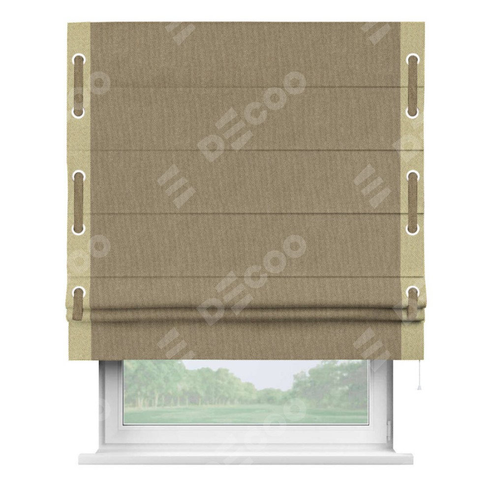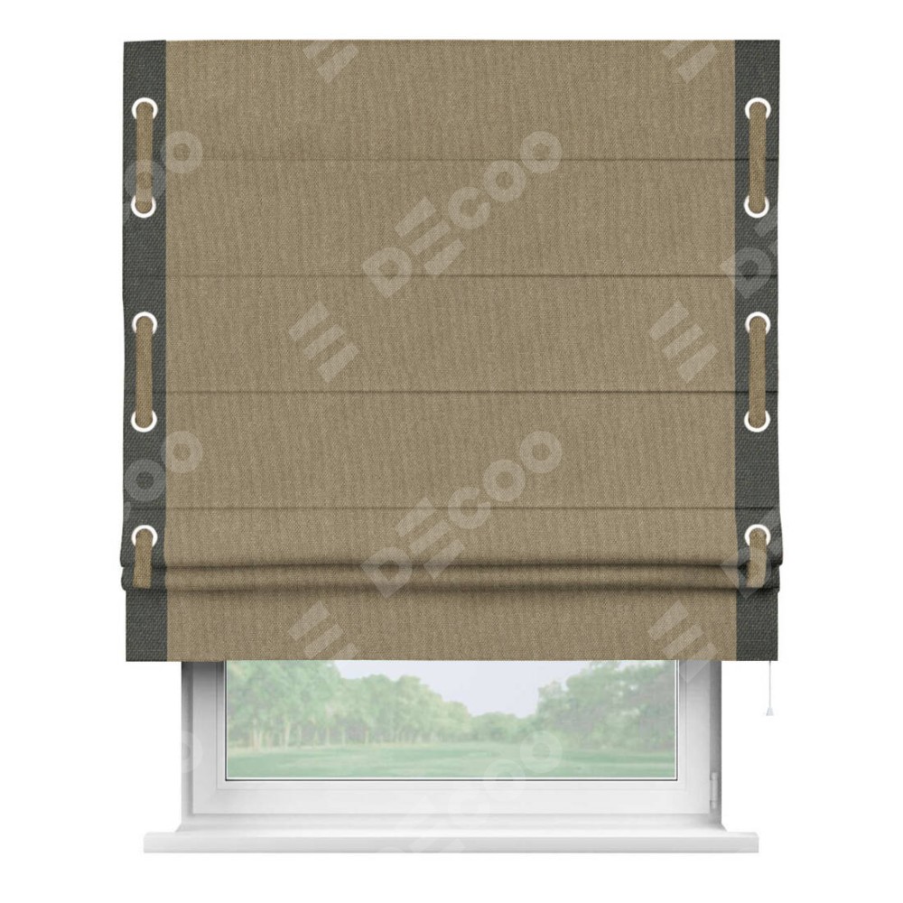 Римская штора «Кортин» для проема, лён димаут тёмно-бежевый с кантом Стрим Дуо (люверсы с пояском)