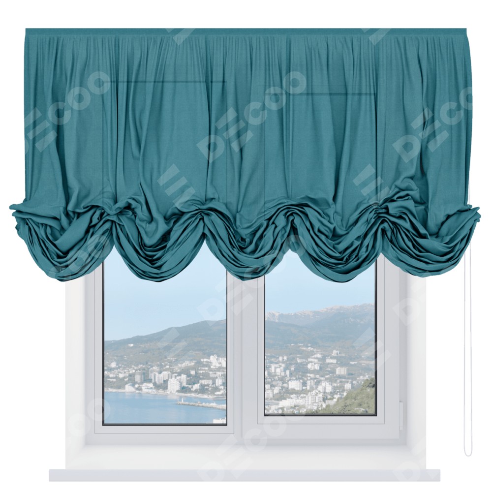 Австрийская штора производителя «Cortin», используется для проёма, пошита из ткани лён бирюзовый, артикул ткани 53436. Имеет универсальный механизм и подходит для монтажа: на потолок и на стену.
