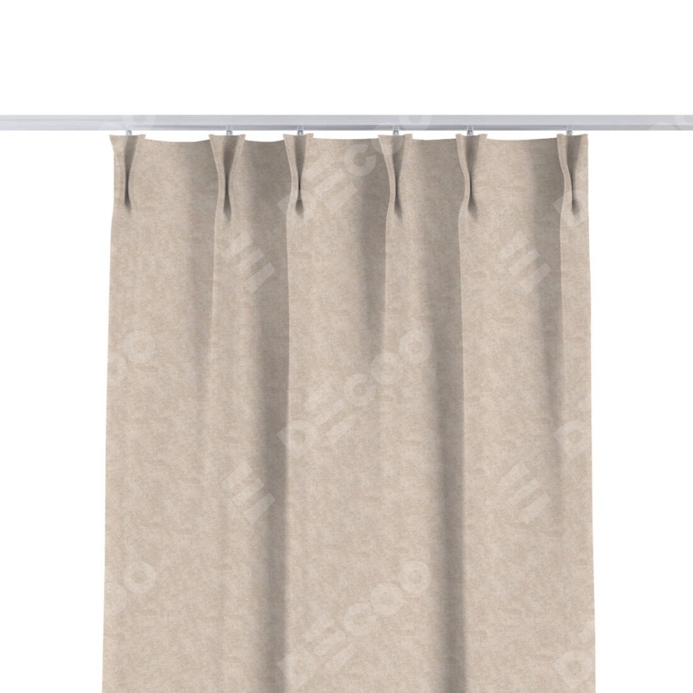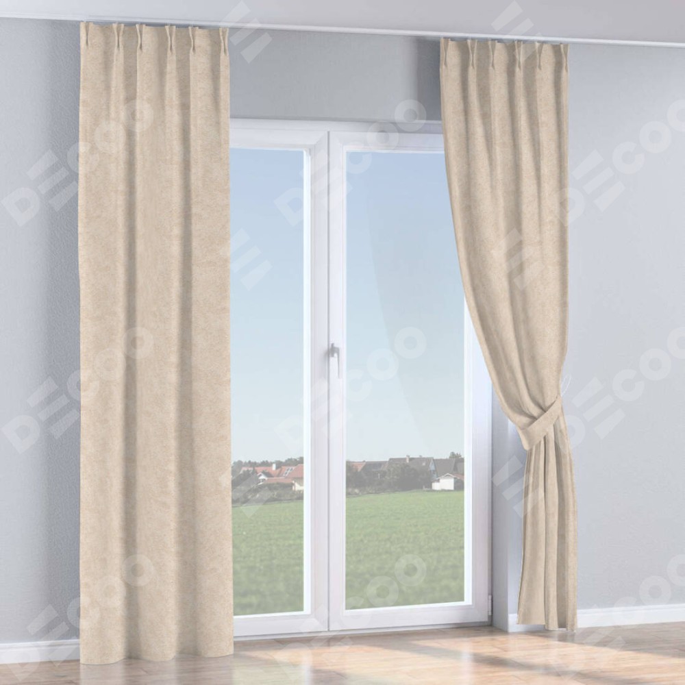 Комплект прямых штор, от производителя «Cortin», пошиты из ткани софт мрамор шампань, артикул ткани 93575. С изнаночной стороны в верхней части штор пристрачивается шторная лента с декоративными складками «Кустик». Для создания элегантных складок прямые шторы шьются по стандарту с коэффициентом 1:2 (на 100 см. ширины проёма 200 см. ширины ткани).