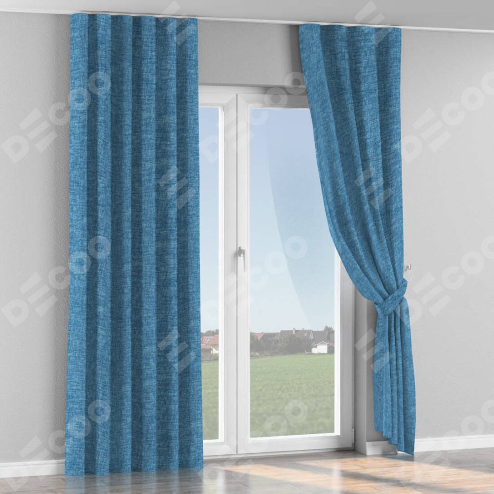 Комплект прямых штор, от производителя «Cortin», пошиты из ткани рогожка димаут джинс, артикул ткани 91026. С изнаночной стороны в верхней части штор пристрачивается шторная лента с декоративными складками «Волна». Для создания элегантных складок прямые шторы шьются по стандарту с коэффициентом 1:2 (на 100 см. ширины проёма 200 см. ширины ткани).
