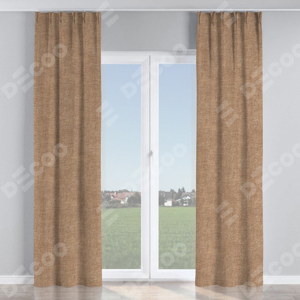 Комплект прямых штор, от производителя «Cortin», пошиты из ткани рогожка димаут светло-коричневый, артикул ткани 91017. С изнаночной стороны в верхней части штор пристрачивается шторная лента с декоративными складками «Кустик». Для создания элегантных складок прямые шторы шьются по стандарту с коэффициентом 1:2 (на 100 см. ширины проёма 200 см. ширины ткани).