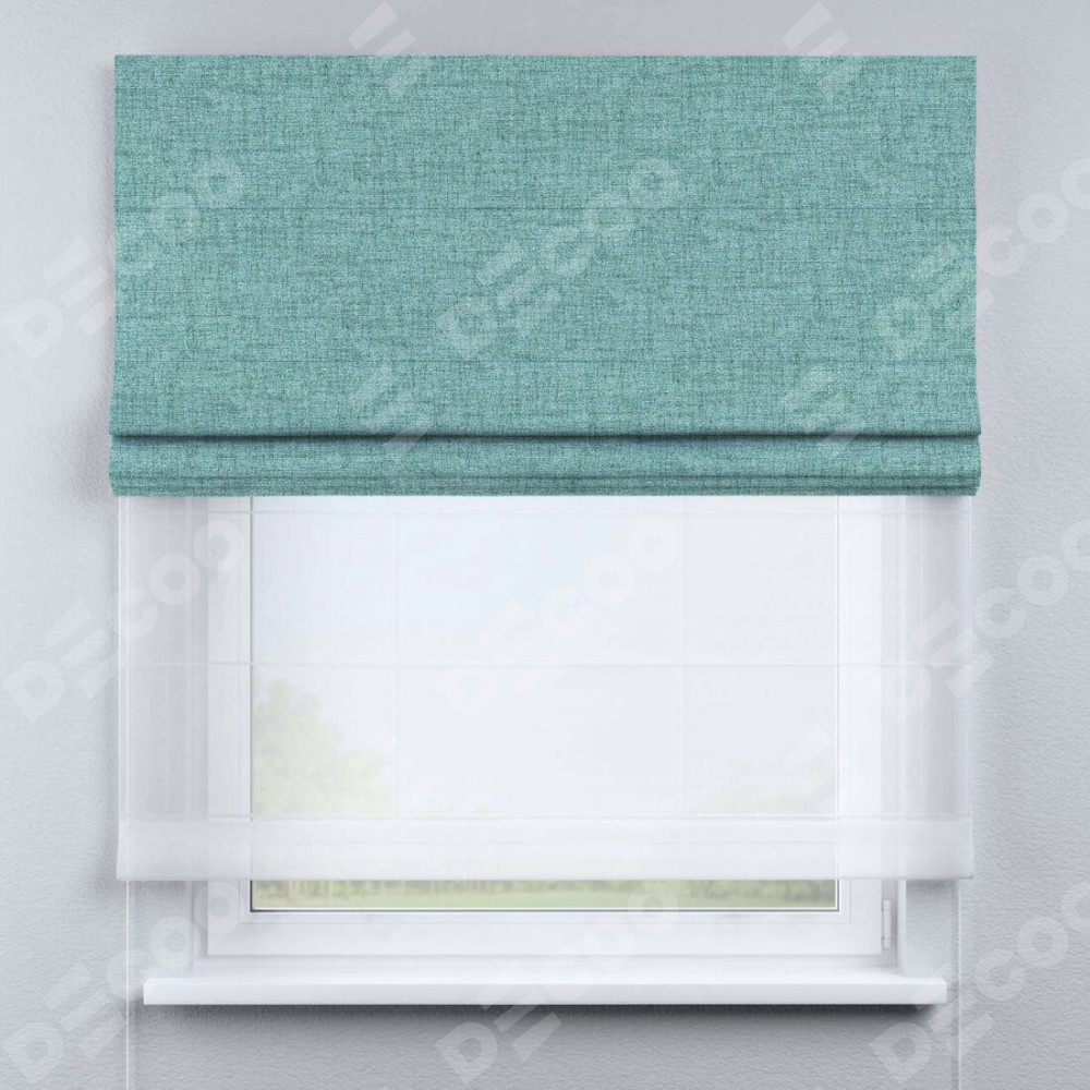 Двойная римская штора «День-ночь» от производителя Cortin предназначена для использования в проёмах. Эта штора уникальна тем, что состоит из двух полотен. На лицевой стороне находится рогожка димаут аквамариновый крайола (артикул: 91023), обеспечивающий эффективное затемнение. В комплект также входит вторая ткань — легкий белый тюль (артикул: V-01), который добавляет изящества и легкости оформлению окна. Кроме того, доступны и другие разновидности ткани тюль, выбор которых доступен по  ссылке .