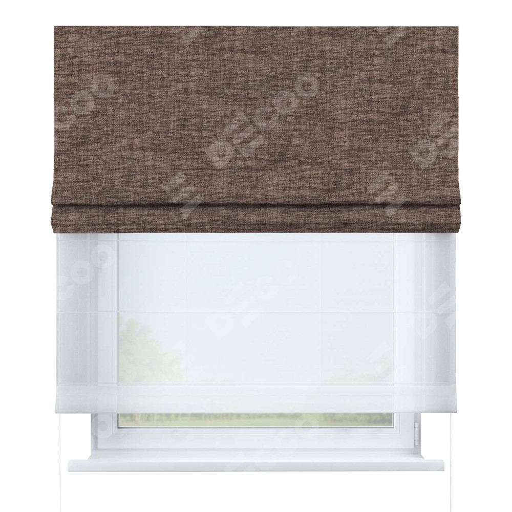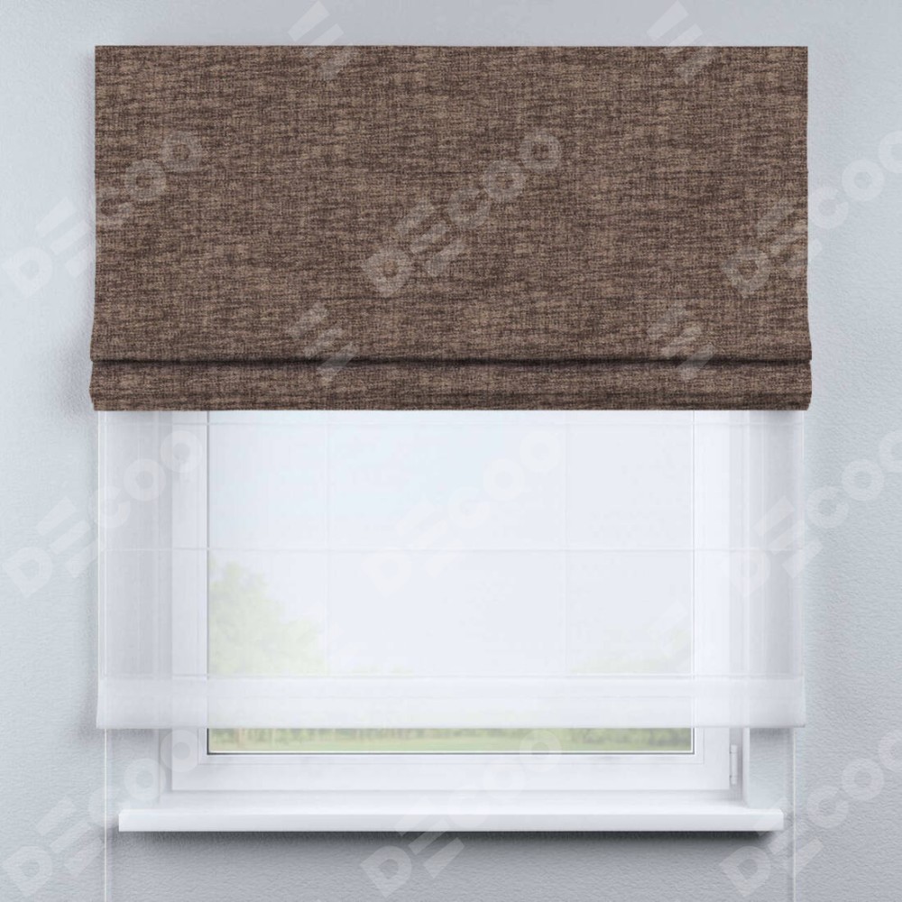 Двойная римская штора «День-ночь» от производителя Cortin предназначена для использования в проёмах. Эта штора уникальна тем, что состоит из двух полотен. На лицевой стороне находится рогожка димаут коричневый (артикул: 91018), обеспечивающий эффективное затемнение. В комплект также входит вторая ткань — легкий белый тюль (артикул: V-01), который добавляет изящества и легкости оформлению окна. Кроме того, доступны и другие разновидности ткани тюль, выбор которых доступен по ссылке .