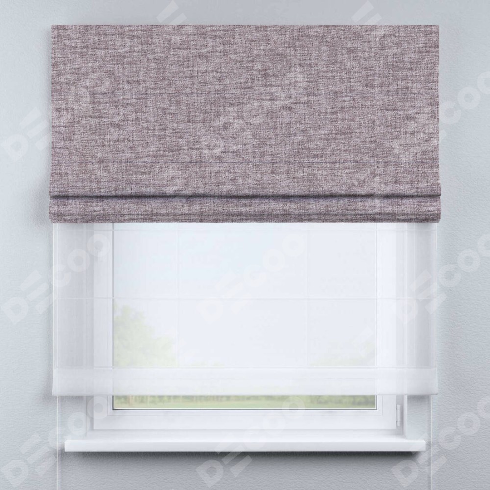 Двойная римская штора «День-ночь» от производителя Cortin предназначена для использования в проёмах. Эта штора уникальна тем, что состоит из двух полотен. На лицевой стороне находится рогожка димаут розовый кварц (артикул: 91030), обеспечивающий эффективное затемнение. В комплект также входит вторая ткань — легкий белый тюль (артикул: V-01), который добавляет изящества и легкости оформлению окна. Кроме того, доступны и другие разновидности ткани тюль, выбор которых доступен по  ссылке .