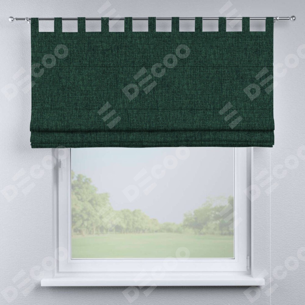Римская штора производителя «Cortin», используется для проёма, пошита из ткани рогожка димаут тёмно-зелёный, артикул ткани 91022. Данная модель пошита на петлях, комплектуется на выбор круглым карнизом и подходит для монтажа на стену. Римская штора на петлях имеет простую систему регулировки высоты, отличительным преимуществом данной модели является простой способ монтажа. Достаточно повесить ее на трубу и штора готова!