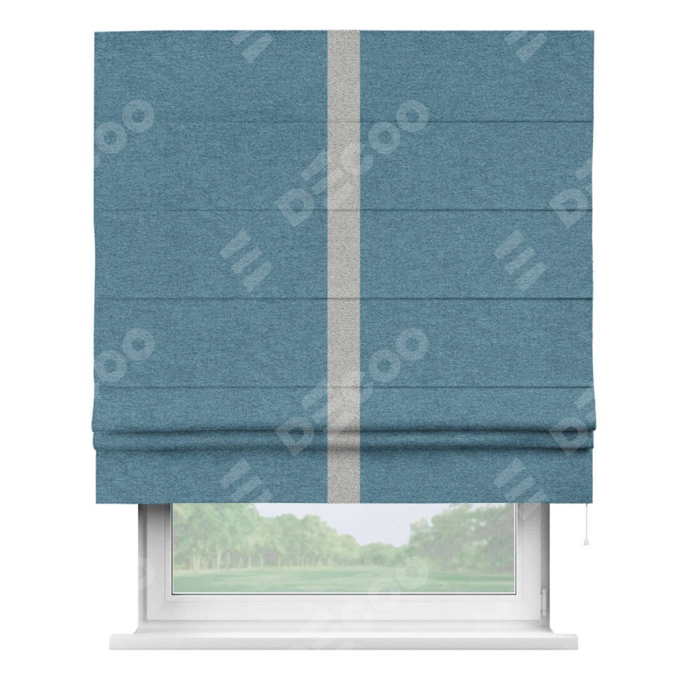 Римская штора пошита из ткани твид блэкаут светло-синий, артикул: 90935, с отделкой кантом «Хайвэй» представляет собой уникальное и смелое дизайнерское решение, где кант расположен вертикально посередине шторы. Этот дизайн не только выделяет штору среди других вариантов оформления окон, но и создает интересный визуальный акцент, привлекая внимание к центру окна и разделяя штору на визуальные зоны. Такой нестандартный подход добавляет динамичности интерьеру и может быть использован для подчеркивания особенностей оформления помещения.