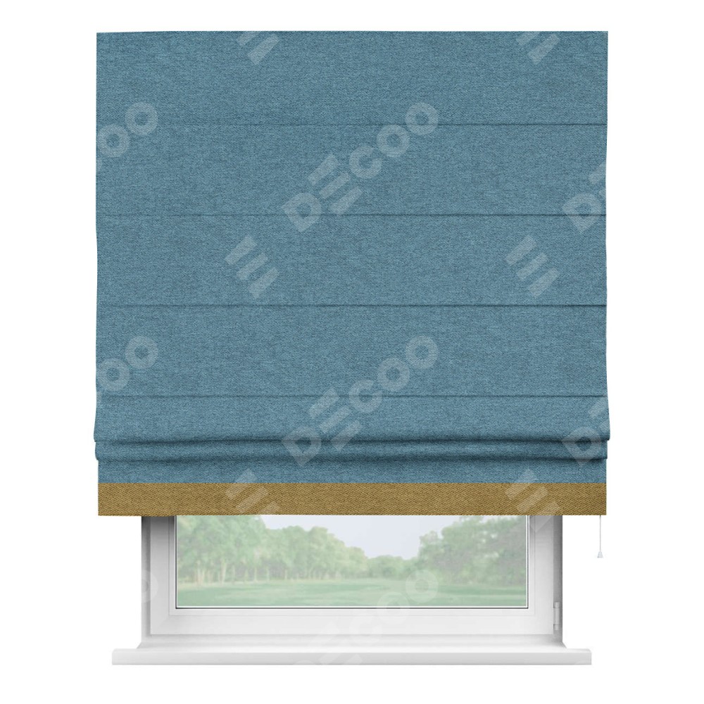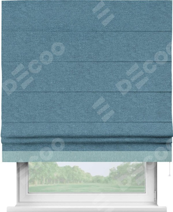 Римская штора пошита из ткани твид блэкаут светло-синий, артикул: 90935, с отделкой кантом «Джестер» выделяется своей уникальной особенностью — кантом, расположенным только снизу шторы. Этот дизайн добавляет оригинальности и игривости оконному оформлению, делая акцент на нижней части шторы и создавая интересный визуальный эффект. Отделка кантом на нижнем крае не только служит эстетической функции, но и способствует увеличению прочности и износостойкости ткани в этом месте.