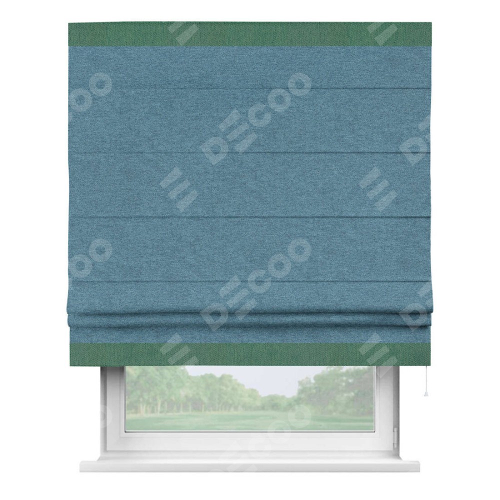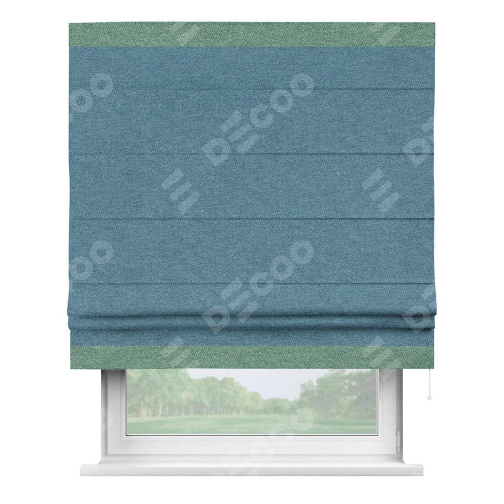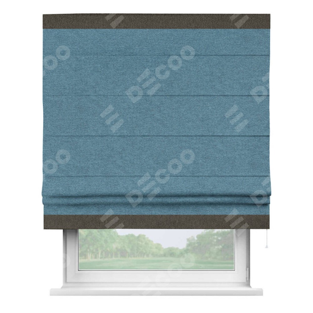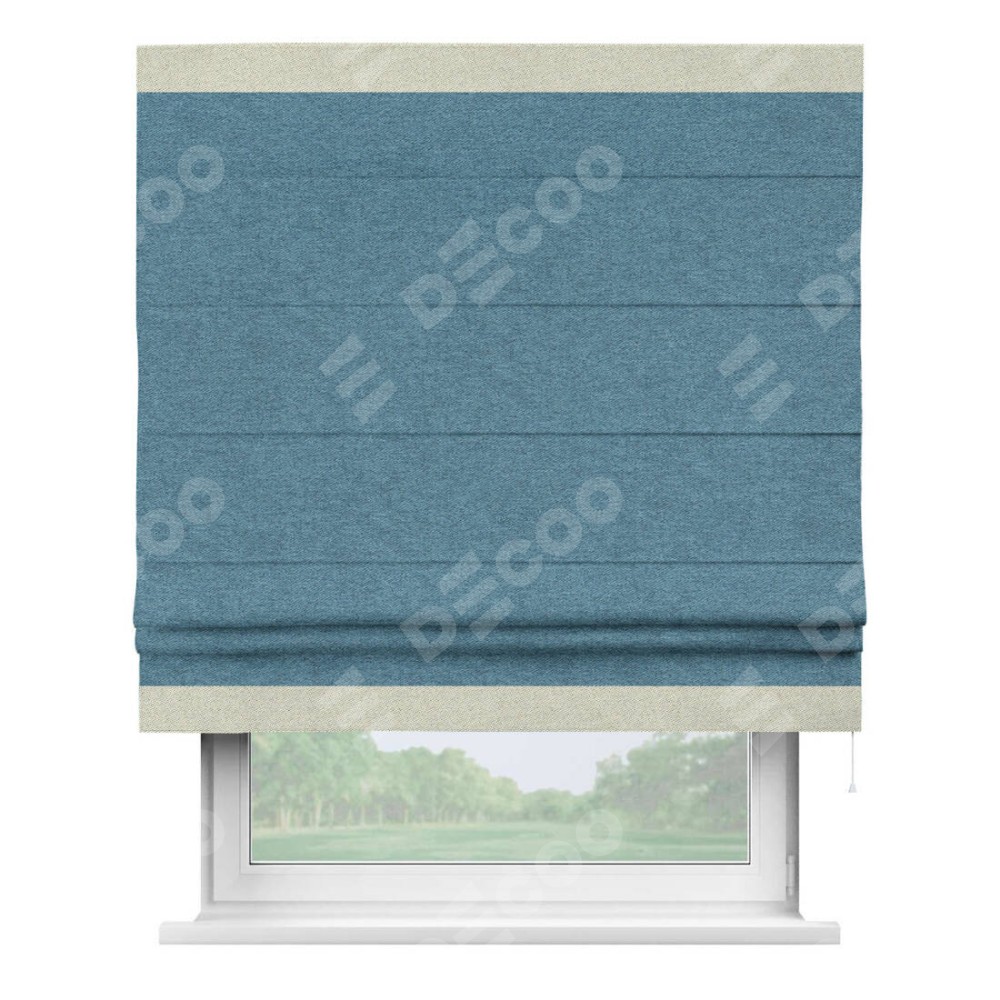 Римская штора пошита из ткани твид блэкаут светло-синий, артикул: 90935, с отделкой кантом «Горизонт» предлагает уникальное дизайнерское решение, при котором кант располагается только вверху и снизу шторы. Такое решение делает акцент на горизонтальных линиях, визуально расширяя пространство и придавая окну более строгий и организованный вид. Отделка кантом в этих ключевых местах не только украшает штору, но и способствует её долговечности, защищая наиболее уязвимые к износу края.