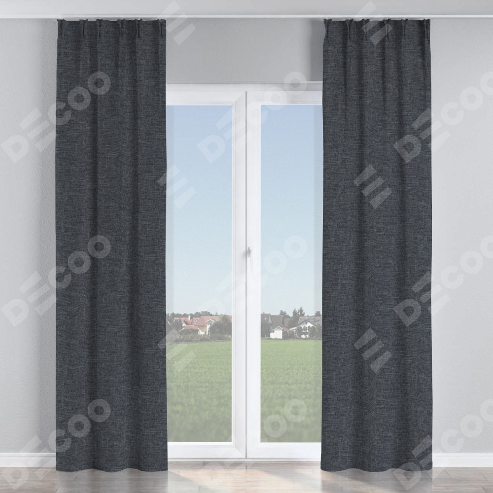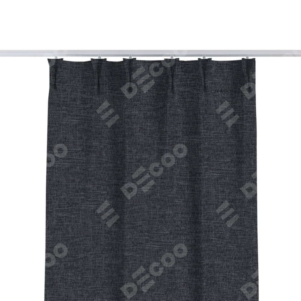 Комплект прямых штор, от производителя «Cortin», пошиты из ткани рогожка димаут графит, артикул ткани 90950. С изнаночной стороны в верхней части штор пристрачивается шторная лента с декоративными складками «Кустик». Для создания элегантных складок прямые шторы шьются по стандарту с коэффициентом 1:2 (на 100 см. ширины проёма 200 см. ширины ткани).