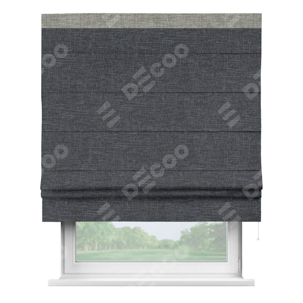 Римская штора пошита из ткани рогожка димаут графит, артикул: 90950, с отделкой кантом «Кинг» отличается своей необычной особенностью: кант располагается исключительно сверху шторы. Такой дизайн делает акцент на верхней части окна, визуально поднимая потолок и придавая интерьеру более возвышенный и изысканный вид. Отделка кантом на верхней кромке не только украшает штору, но и может служить дополнительной защитой от износа в месте наибольшего контакта с механизмом управления шторой.
