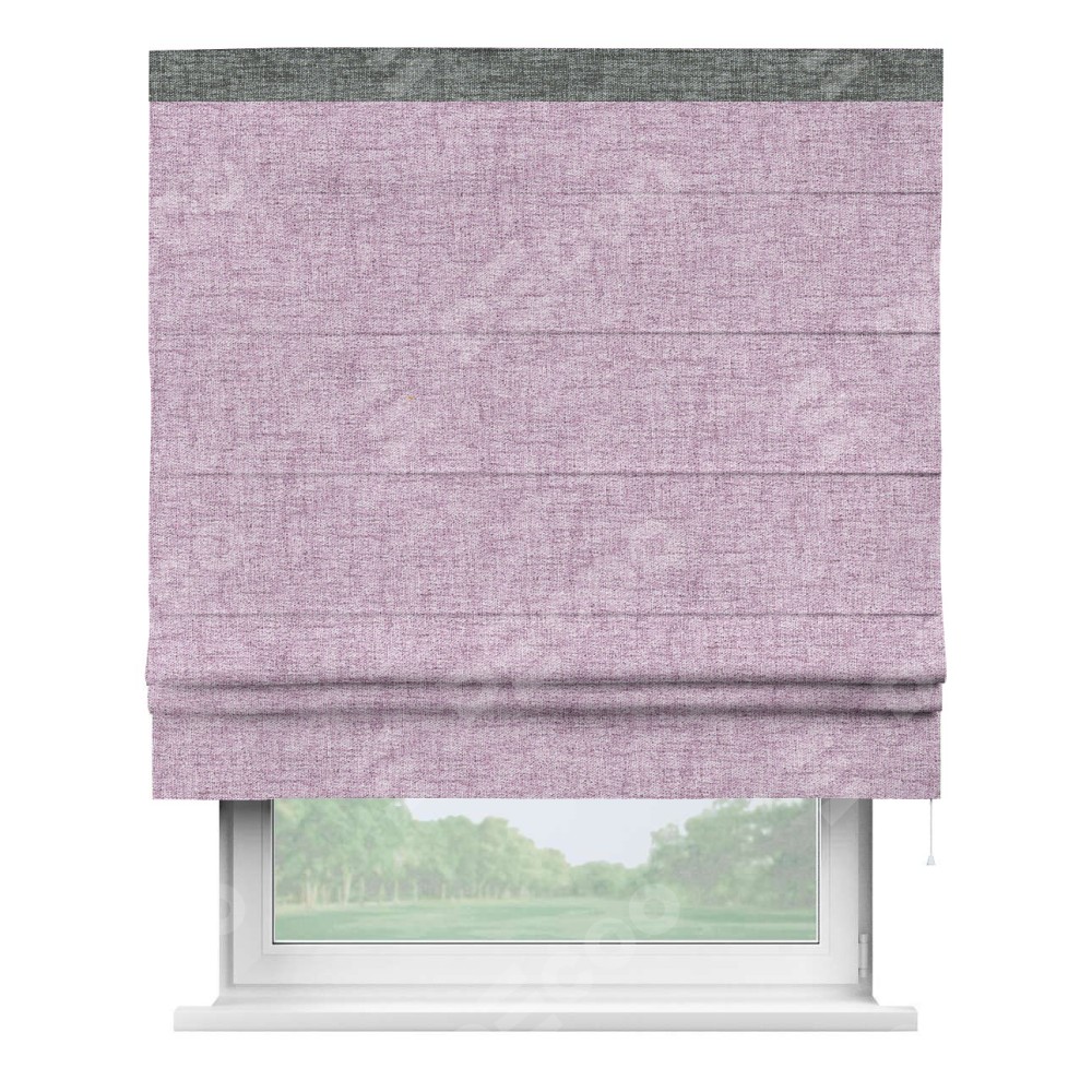 Римская штора пошита из ткани рогожка димаут розовый, артикул: 91031, с отделкой кантом «Кинг» отличается своей необычной особенностью: кант располагается исключительно сверху шторы. Такой дизайн делает акцент на верхней части окна, визуально поднимая потолок и придавая интерьеру более возвышенный и изысканный вид. Отделка кантом на верхней кромке не только украшает штору, но и может служить дополнительной защитой от износа в месте наибольшего контакта с механизмом управления шторой.