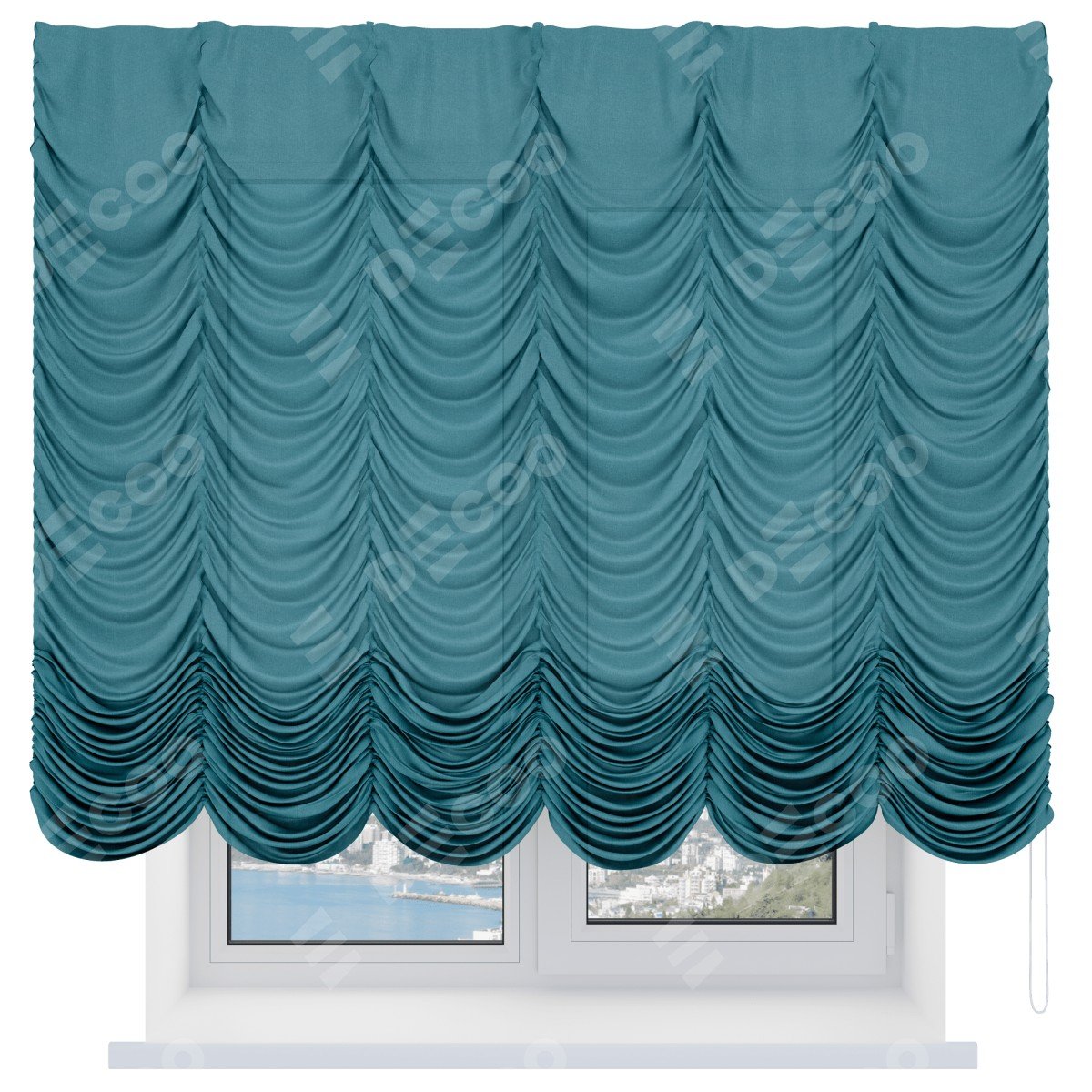 Французская штора производителя «Cortin», используется для проёма, пошита из ткани лён бирюзовый, артикул ткани 53436. Имеет универсальный механизм и подходит для монтажа: на потолок и на стену.