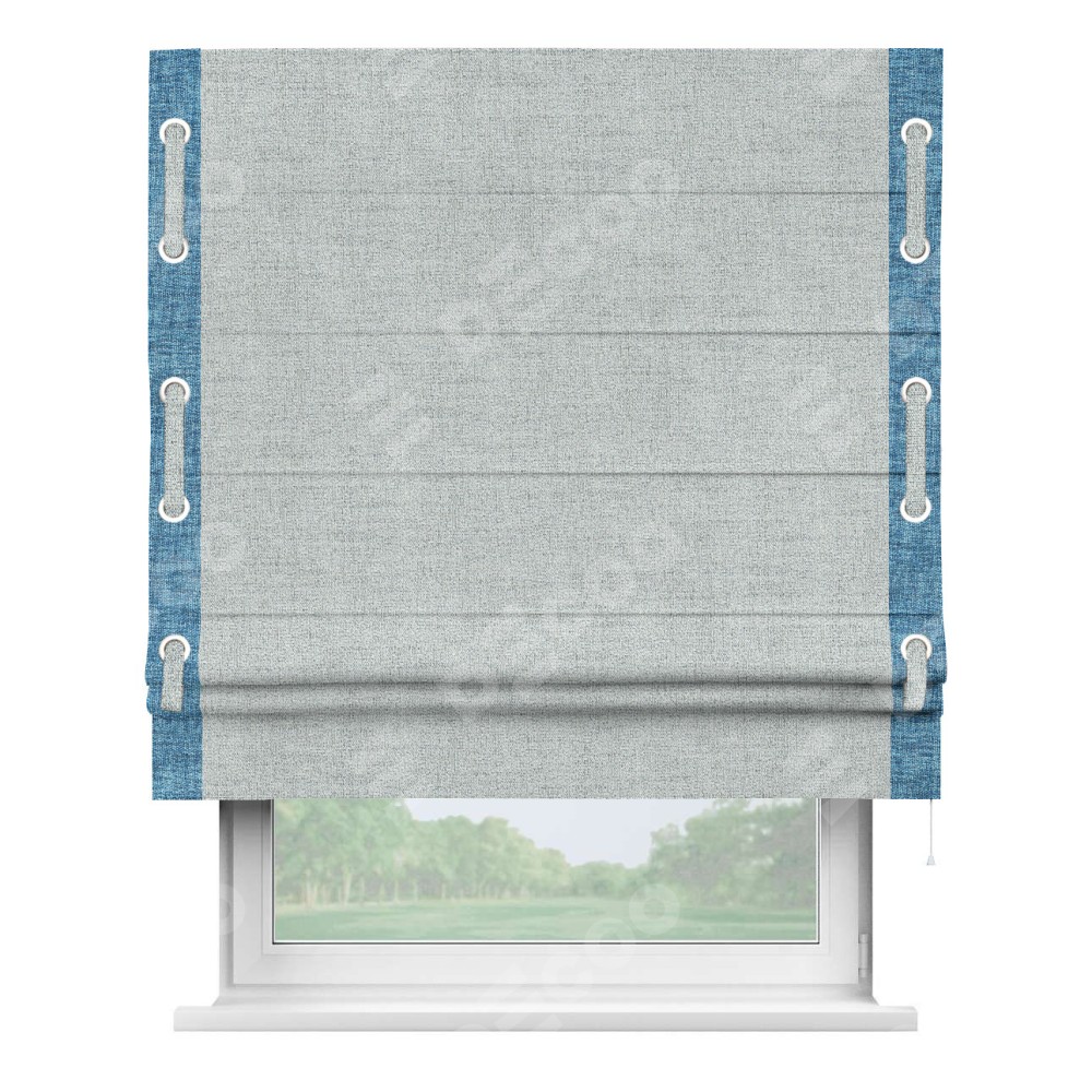 Римская штора «Кортин» для проёма, рогожка димаут серый, с кантом Стрим Дуо (люверсы с пояском)