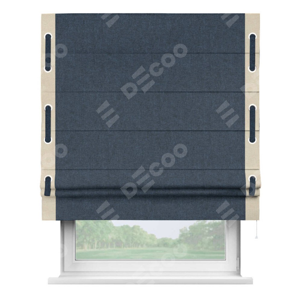 Римская штора «Кортин» для проёма, лён кашемир синий, с кантом Стрим Дуо (люверсы с пояском)