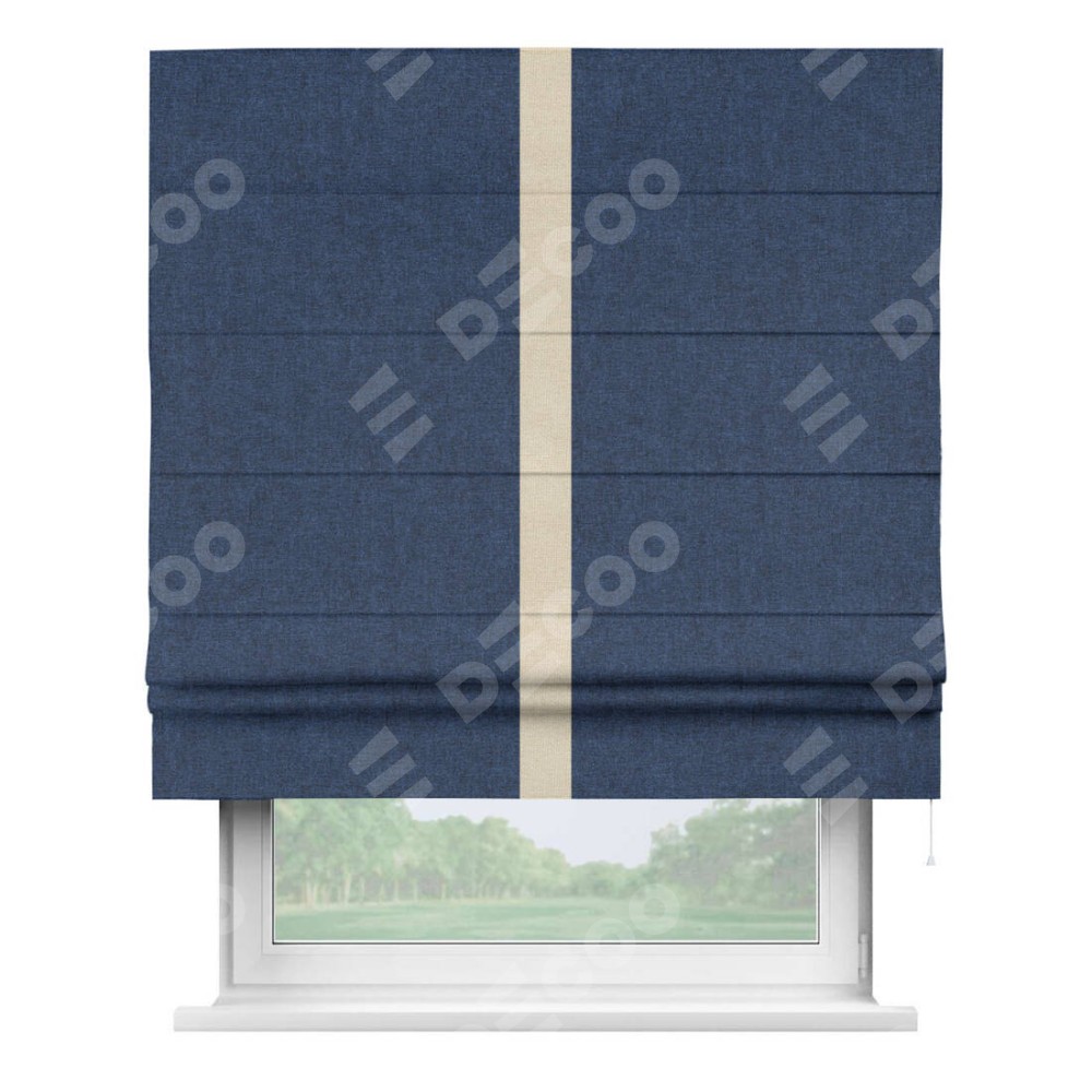 Римская штора пошита из ткани лён кашемир тёмно-синий, артикул: 17215, с отделкой кантом «Хайвэй» представляет собой уникальное и смелое дизайнерское решение, где кант расположен вертикально посередине шторы. Этот дизайн не только выделяет штору среди других вариантов оформления окон, но и создает интересный визуальный акцент, привлекая внимание к центру окна и разделяя штору на визуальные зоны. Такой нестандартный подход добавляет динамичности интерьеру и может быть использован для подчеркивания особенностей оформления помещения.
