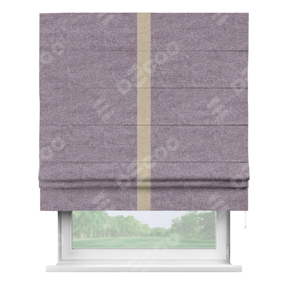 Римская штора пошита из ткани лён кашемир фиолетовый, артикул: 17211, с отделкой кантом «Хайвэй» представляет собой уникальное и смелое дизайнерское решение, где кант расположен вертикально посередине шторы. Этот дизайн не только выделяет штору среди других вариантов оформления окон, но и создает интересный визуальный акцент, привлекая внимание к центру окна и разделяя штору на визуальные зоны. Такой нестандартный подход добавляет динамичности интерьеру и может быть использован для подчеркивания особенностей оформления помещения.