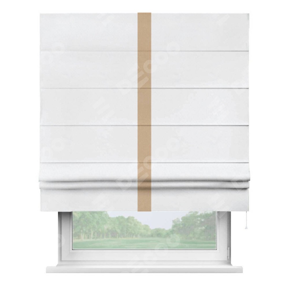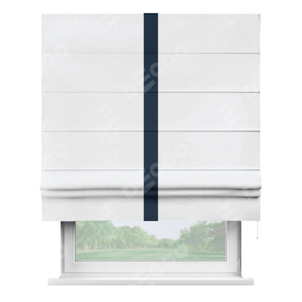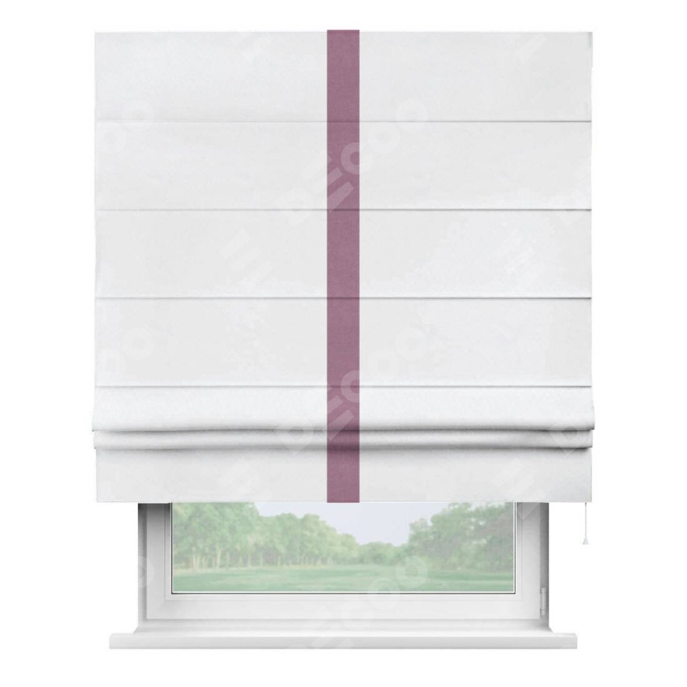 Римская штора пошита из ткани вельвет белоснежный, артикул: 92698, с отделкой кантом «Хайвэй» представляет собой уникальное и смелое дизайнерское решение, где кант расположен вертикально посередине шторы. Этот дизайн не только выделяет штору среди других вариантов оформления окон, но и создает интересный визуальный акцент, привлекая внимание к центру окна и разделяя штору на визуальные зоны. Такой нестандартный подход добавляет динамичности интерьеру и может быть использован для подчеркивания особенностей оформления помещения.