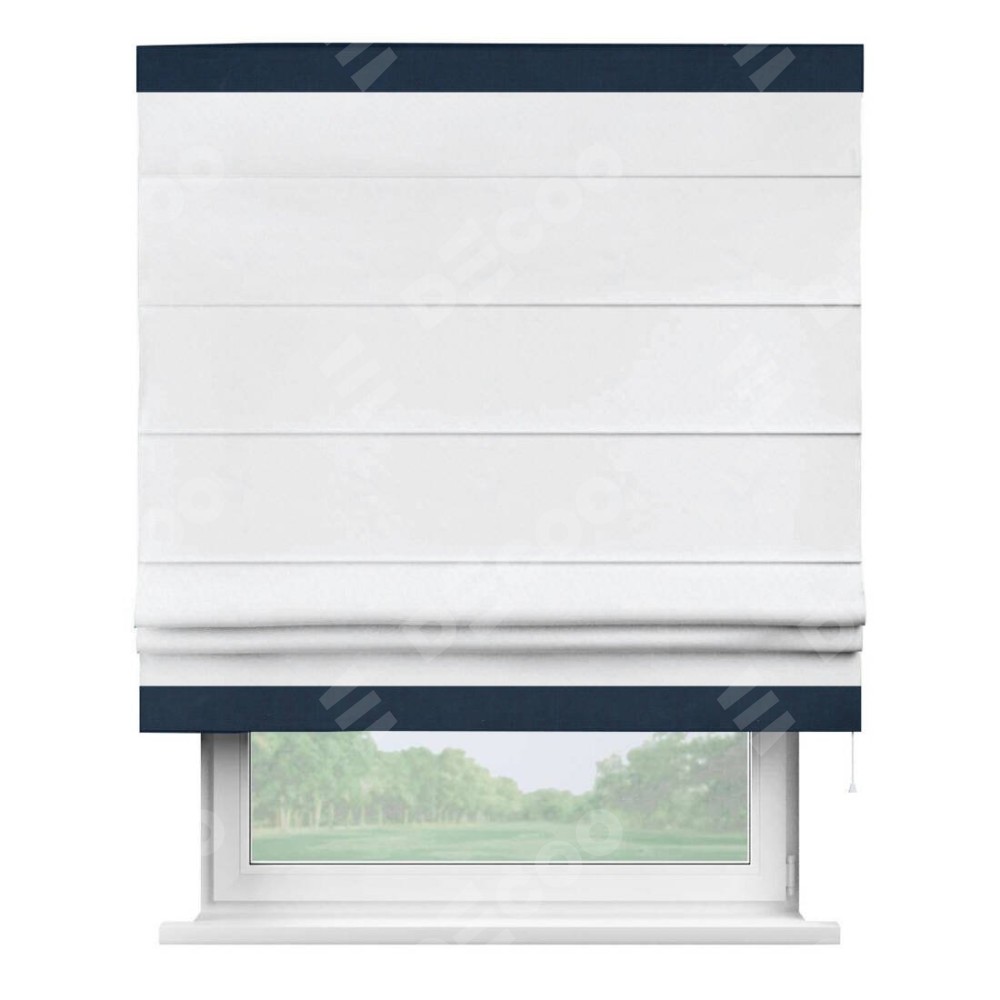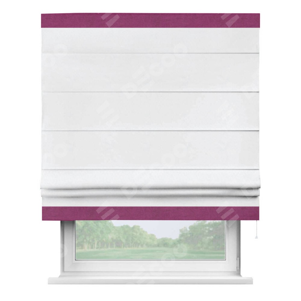 Римская штора пошита из ткани вельвет белоснежный, артикул: 92698, с отделкой кантом «Горизонт» предлагает уникальное дизайнерское решение, при котором кант располагается только вверху и снизу шторы. Такое решение делает акцент на горизонтальных линиях, визуально расширяя пространство и придавая окну более строгий и организованный вид. Отделка кантом в этих ключевых местах не только украшает штору, но и способствует её долговечности, защищая наиболее уязвимые к износу края.