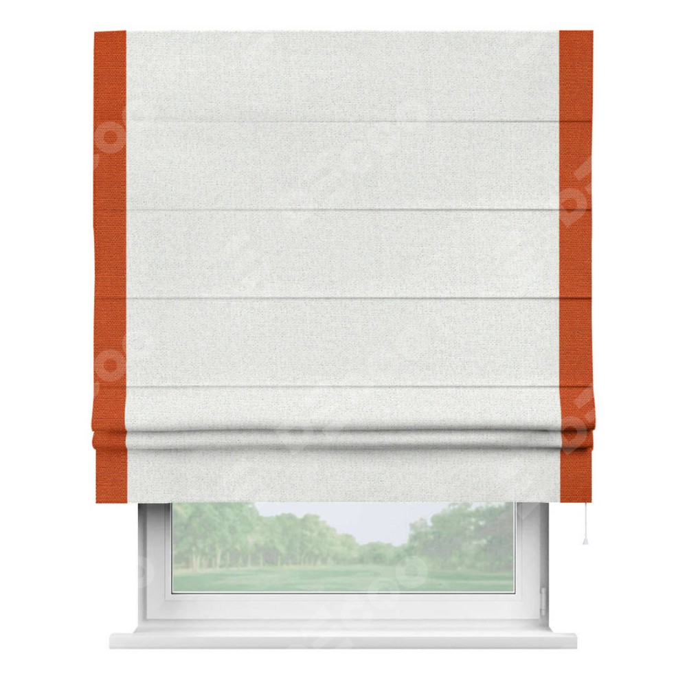 Римская штора пошита из ткани лён шампань, артикул: 91399, с отделкой кантом «Стрим Дуо» выделяется наличием кантов по обоим бокам шторы, слева и справа. Этот дизайн придает шторе аккуратный и завершенный вид, акцентируя вертикальные линии и визуально вытягивая окно в высоту. Отделка кантом по бокам не только украшает штору, но и служит практической функцией, укрепляя края и продлевая срок службы изделия.