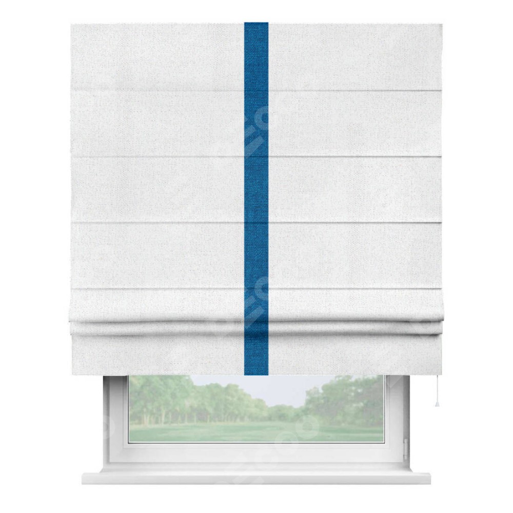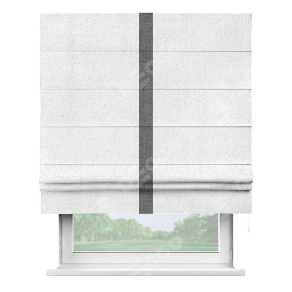 Римская штора пошита из ткани лён белоснежный, артикул: 95632, с отделкой кантом «Хайвэй» представляет собой уникальное и смелое дизайнерское решение, где кант расположен вертикально посередине шторы. Этот дизайн не только выделяет штору среди других вариантов оформления окон, но и создает интересный визуальный акцент, привлекая внимание к центру окна и разделяя штору на визуальные зоны. Такой нестандартный подход добавляет динамичности интерьеру и может быть использован для подчеркивания особенностей оформления помещения.
