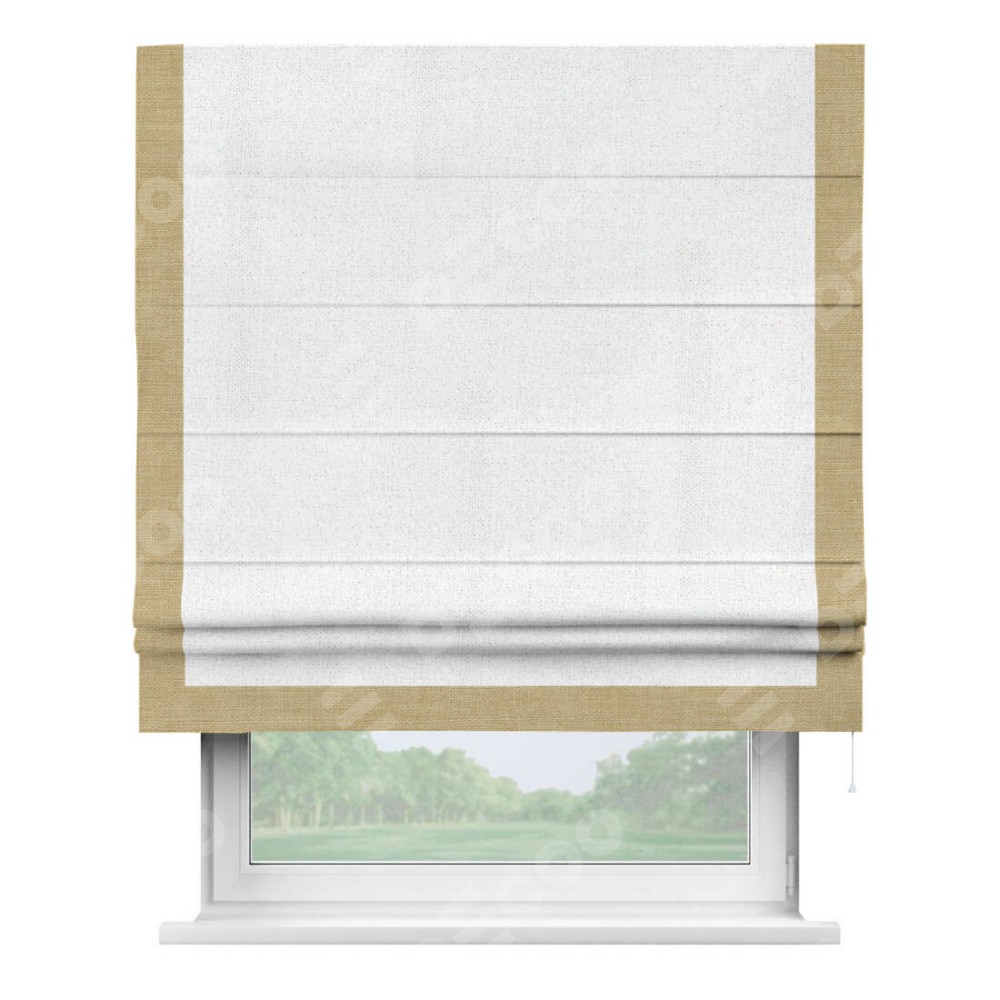 Римская штора с отделкой кантом «Виктория», пошита из ткани лён белоснежный, артикул: 95632. представляет собой элегантное решение для оконного оформления. Кант по бокам и снизу шторы добавляет изысканности и аккуратности внешнему виду, подчеркивая линии и форму шторы. Этот элемент декора не только украшает, но и выполняет практическую функцию, защищая края ткани от износа. Кант может быть выполнен в контрастном или гармонирующем цвете, что позволяет добиться различных стилевых эффектов и легко вписать штору в интерьер комнаты.