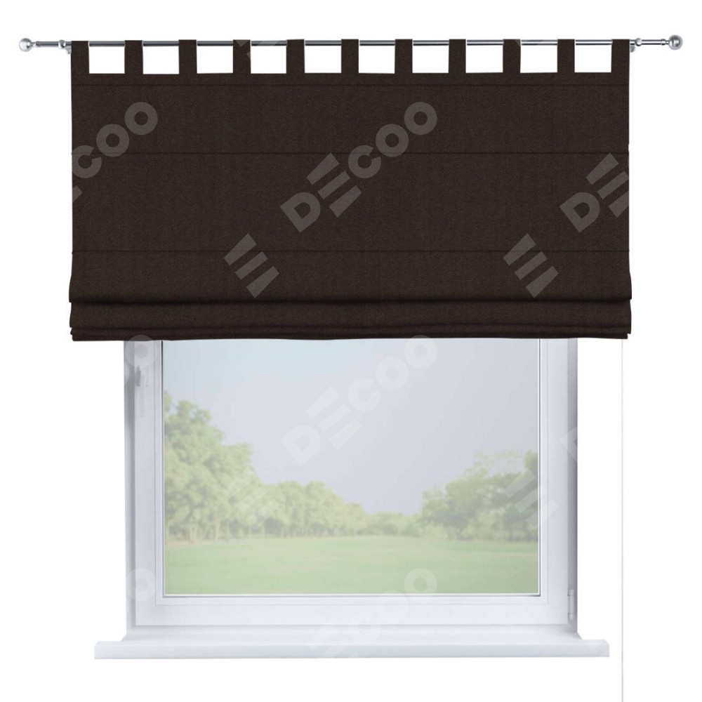 Римская штора производителя «Cortin», используется для проёма, пошита из ткани лён димаут венге, артикул ткани 91001. Данная модель пошита на петлях, комплектуется на выбор круглым карнизом и подходит для монтажа на стену. Римская штора на петлях имеет простую систему регулировки высоты, отличительным преимуществом данной модели является простой способ монтажа. Достаточно повесить ее на трубу и штора готова!