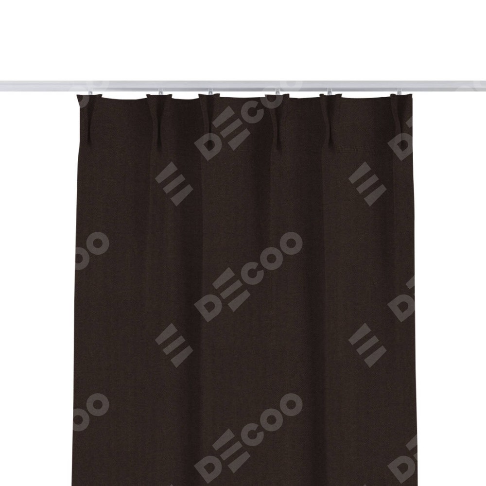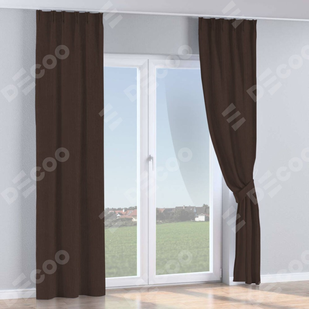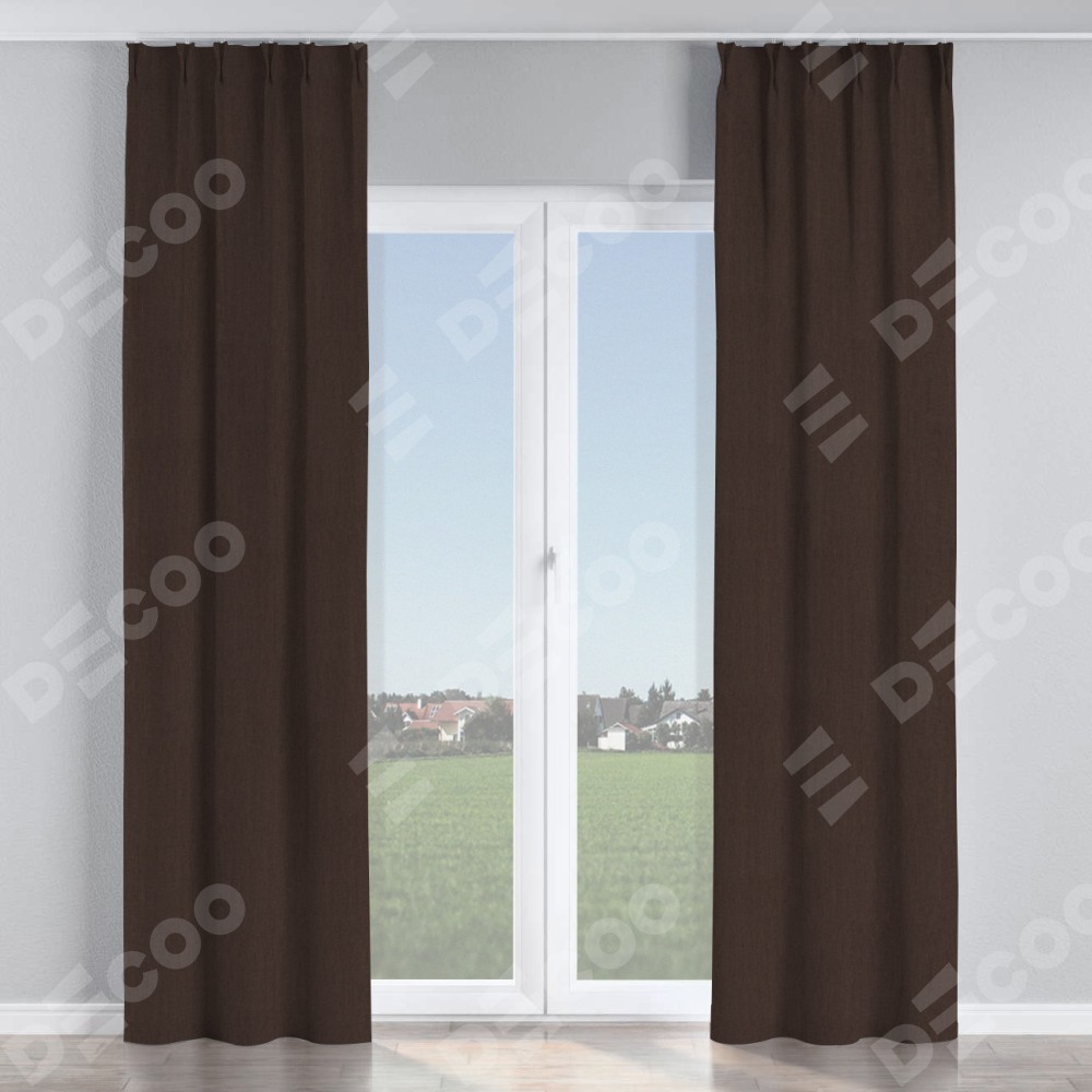 Комплект прямых штор, от производителя «Cortin», пошиты из ткани лён димаут венге, артикул ткани 91001. С изнаночной стороны в верхней части штор пристрачивается шторная лента с декоративными складками «Кустик». Для создания элегантных складок прямые шторы шьются по стандарту с коэффициентом 1:2 (на 100 см. ширины проёма 200 см. ширины ткани).