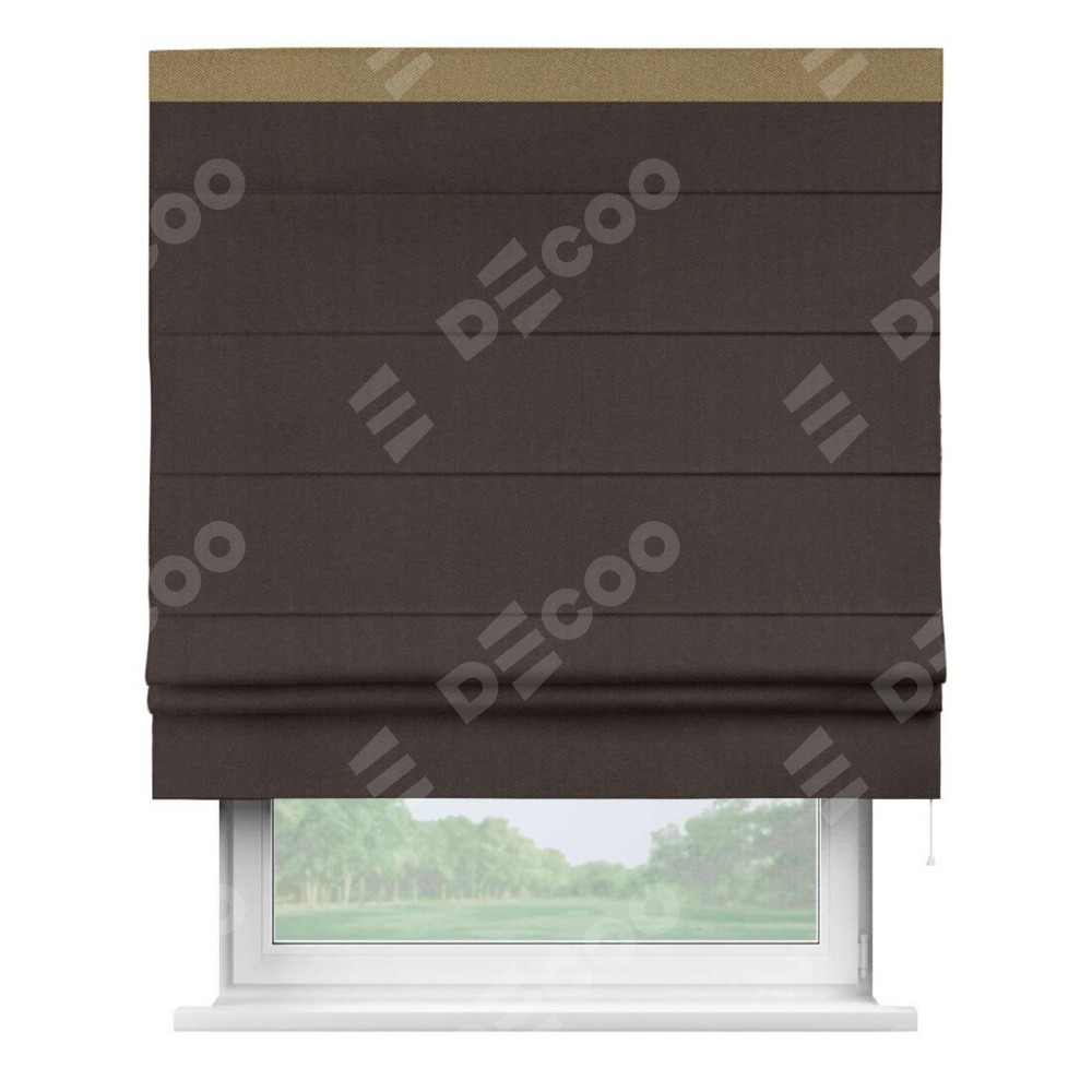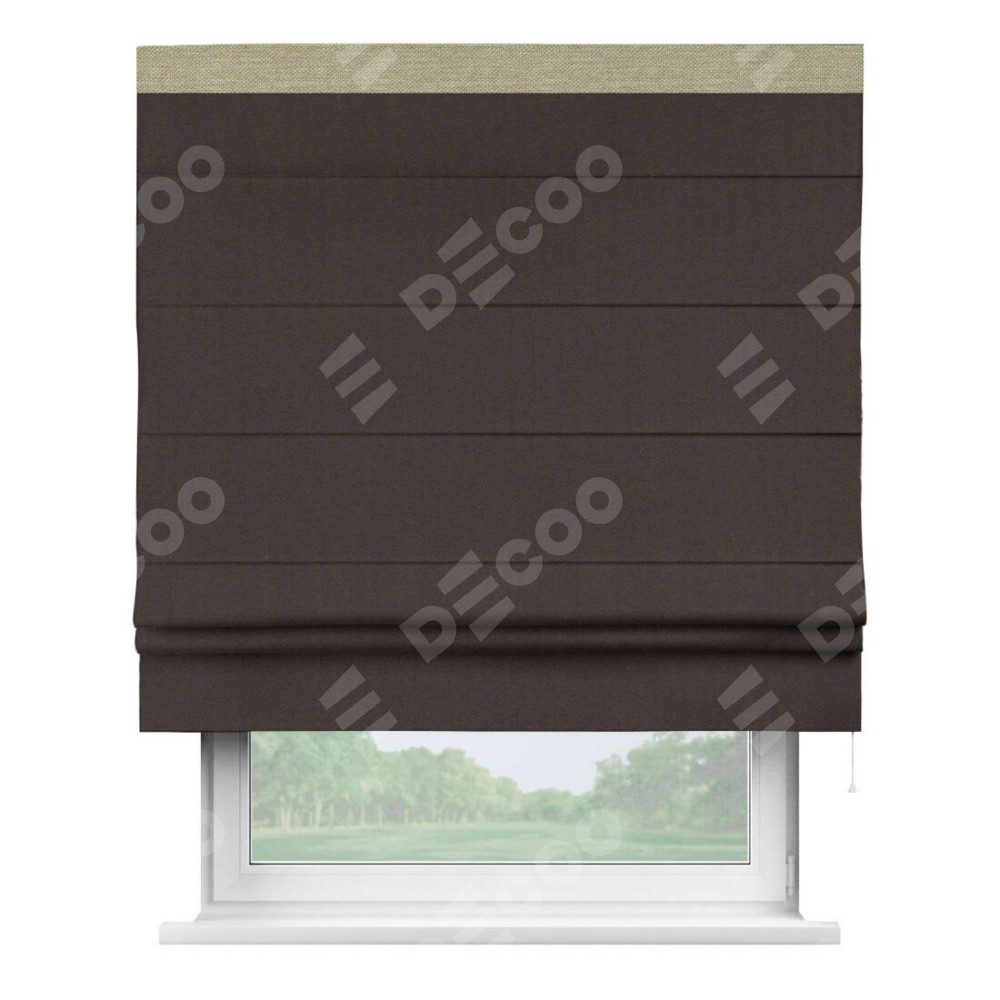 Римская штора пошита из ткани лён димаут венге, артикул: 91001, с отделкой кантом «Кинг» отличается своей необычной особенностью: кант располагается исключительно сверху шторы. Такой дизайн делает акцент на верхней части окна, визуально поднимая потолок и придавая интерьеру более возвышенный и изысканный вид. Отделка кантом на верхней кромке не только украшает штору, но и может служить дополнительной защитой от износа в месте наибольшего контакта с механизмом управления шторой.