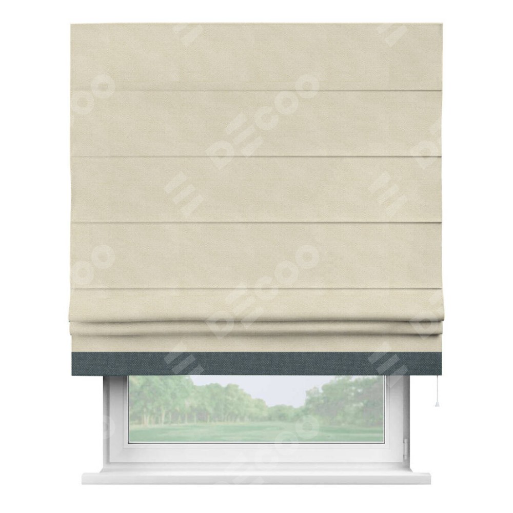 Римская штора производителя «Cortin», используется для проёма, пошита из ткани лён димаут бежевый, артикул 83023. Отделка шторы кантом «Джестер», ткань для канта используется из льна димаут разной расцветки на выбор. Имеет универсальный механизм и подходит для монтажа: на потолок, на стену и в нишу.
