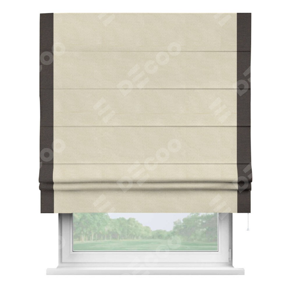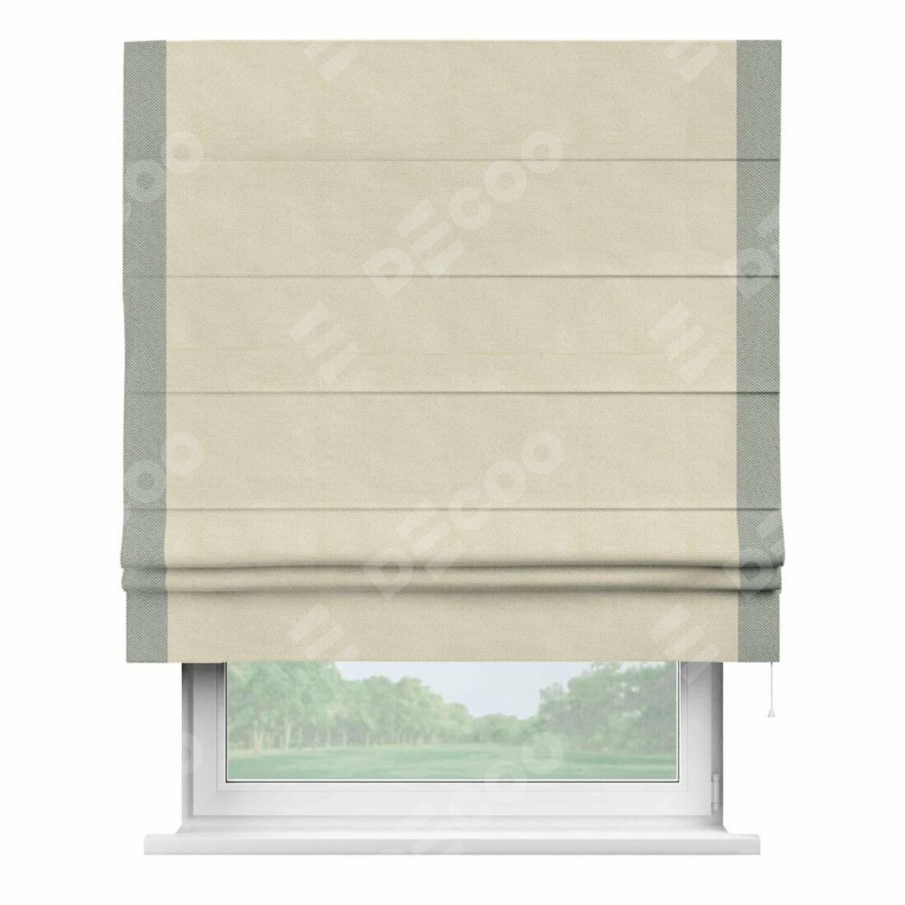 Римская штора производителя «Cortin», используется для проёма, пошита из ткани лён димаут бежевый, артикул 83023. Отделка шторы кантом «Стрим Дуо», ткань для канта используется из льна димаут разной расцветки на выбор. Имеет универсальный механизм и подходит для монтажа: на потолок, на стену и в нишу.