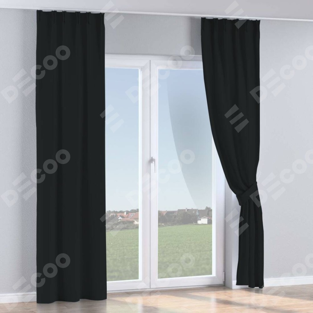 Комплект прямых штор, от производителя «Cortin», пошиты из ткани блэкаут однотонный черный, артикул ткани 37. С изнаночной стороны в верхней части штор пристрачивается шторная лента с декоративными складками «Кустик». Для создания элегантных складок прямые шторы шьются по стандарту с коэффициентом 1:2 (на 100 см. ширины проёма 200 см. ширины ткани).