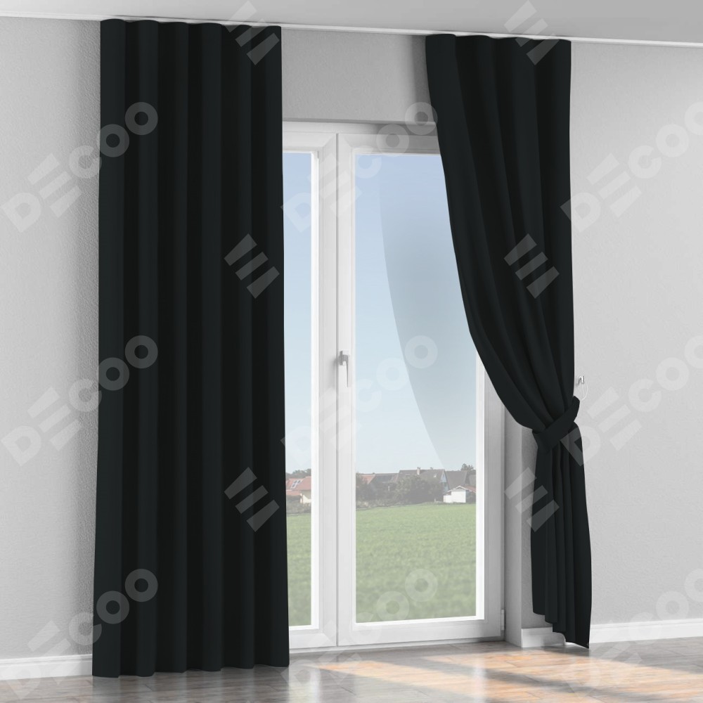 Комплект прямых штор, от производителя «Cortin», пошиты из ткани блэкаут однотонный черный, артикул ткани 37. С изнаночной стороны в верхней части штор пристрачивается шторная лента с декоративными складками «Волна». Для создания элегантных складок прямые шторы шьются по стандарту с коэффициентом 1:2 (на 100 см. ширины проёма 200 см. ширины ткани).