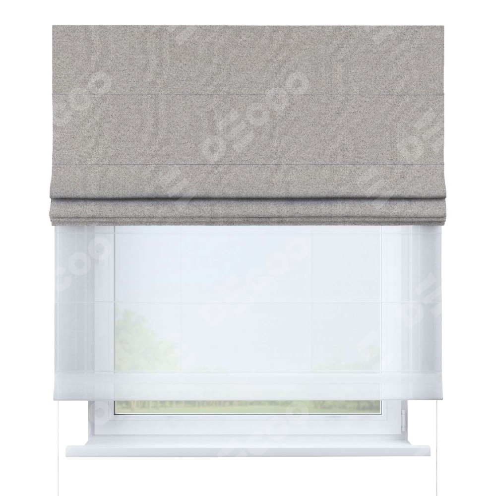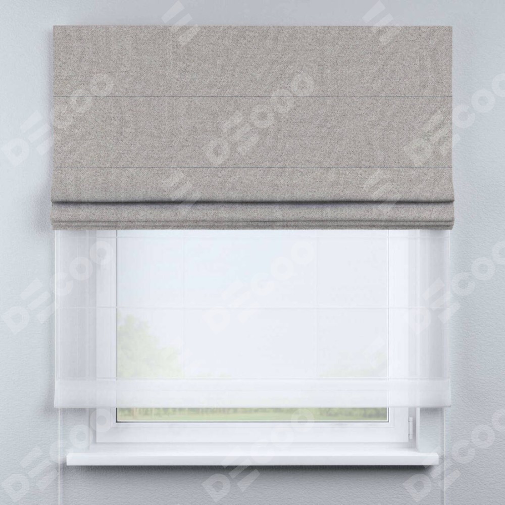 Двойная римская штора «День-ночь» от производителя Cortin предназначена для использования в проёмах. Эта штора уникальна тем, что состоит из двух полотен. На лицевой стороне находится лён димаут серо-бежевый (артикул: 17), обеспечивающий эффективное затемнение. В комплект также входит вторая ткань — легкий белый тюль (артикул: V-01), который добавляет изящества и легкости оформлению окна. Кроме того, доступны и другие разновидности ткани тюль, выбор которых доступен по  ссылке .