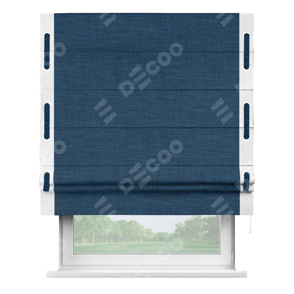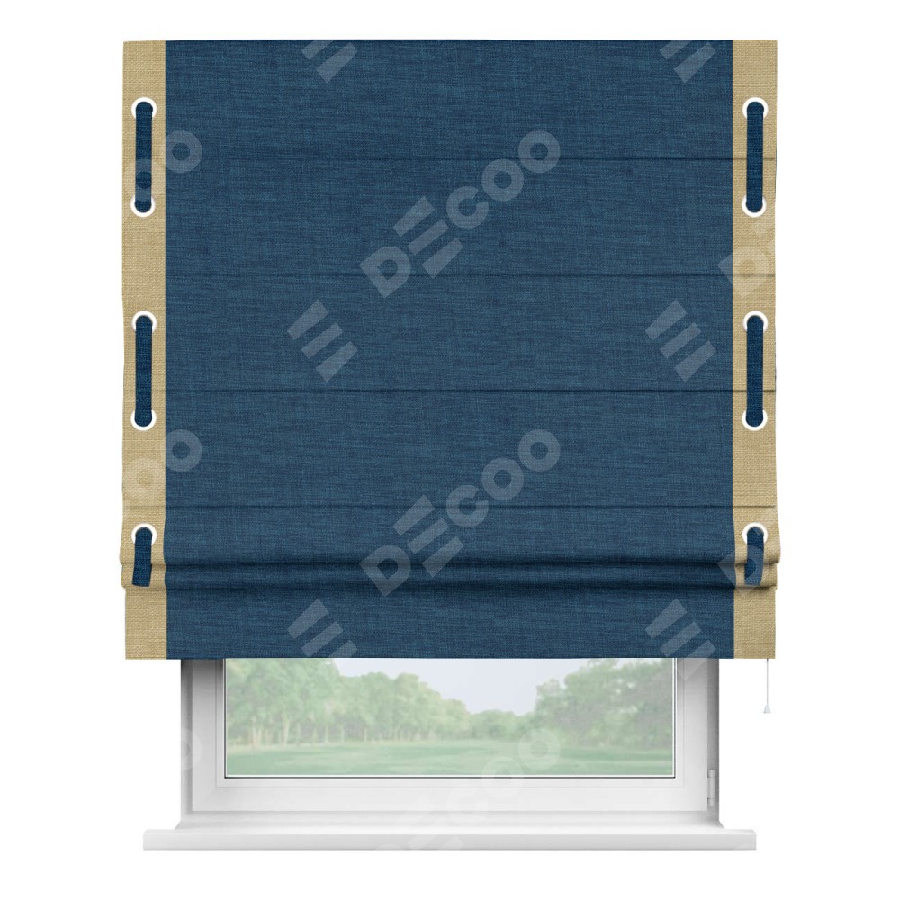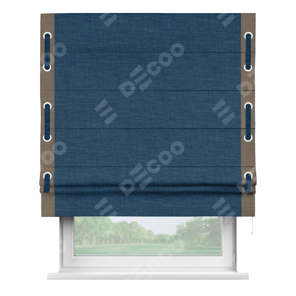 Римская штора «Кортин» для проёма, лён синий, с кантом Стрим Дуо (люверсы с пояском)