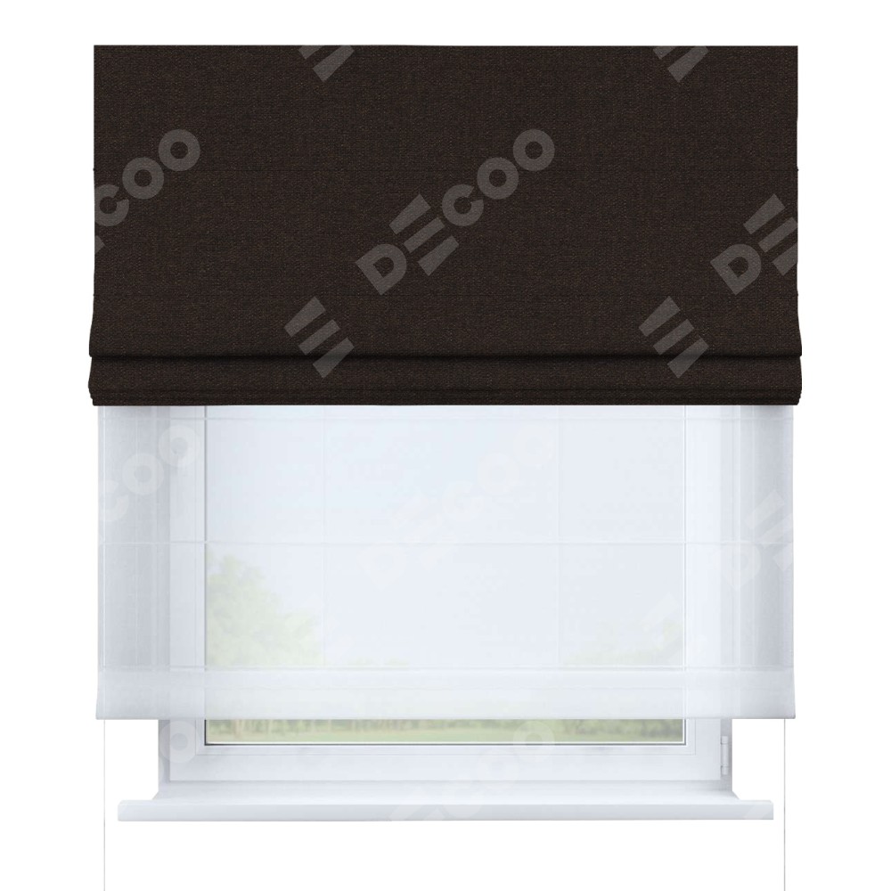 Двойная римская штора «День-ночь» от производителя Cortin предназначена для использования в проёмах. Эта штора уникальна тем, что состоит из двух полотен. На лицевой стороне находится лён тёмно-коричневый (артикул: 104497), обеспечивающий эффективное затемнение. В комплект также входит вторая ткань — легкий белый тюль (артикул: V-01), который добавляет изящества и легкости оформлению окна. Кроме того, доступны и другие разновидности ткани тюль, выбор которых доступен по  ссылке .
