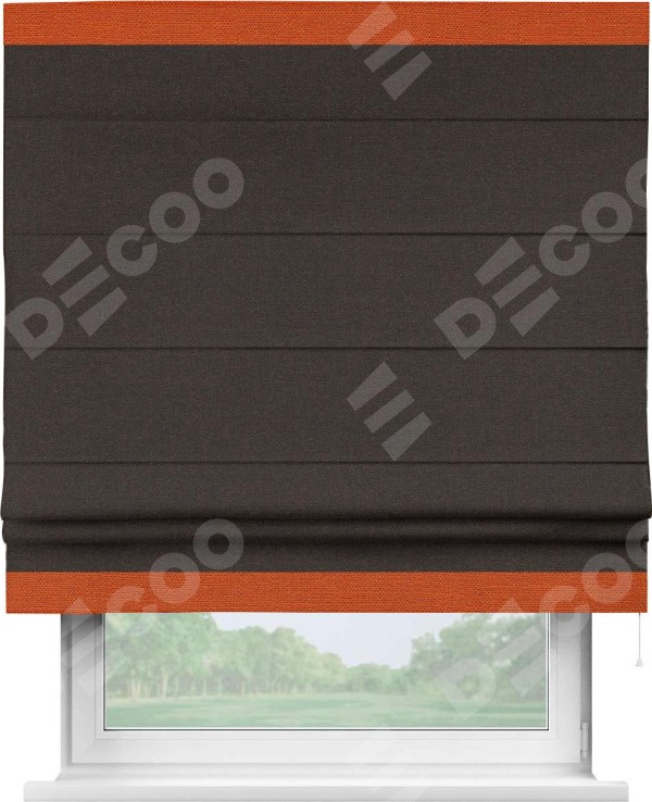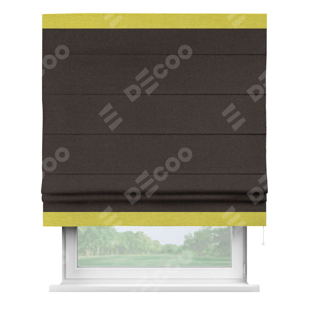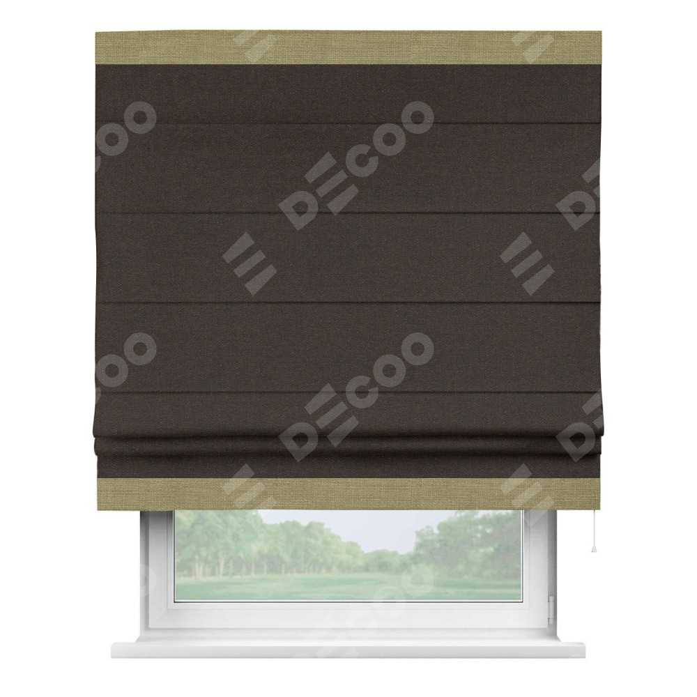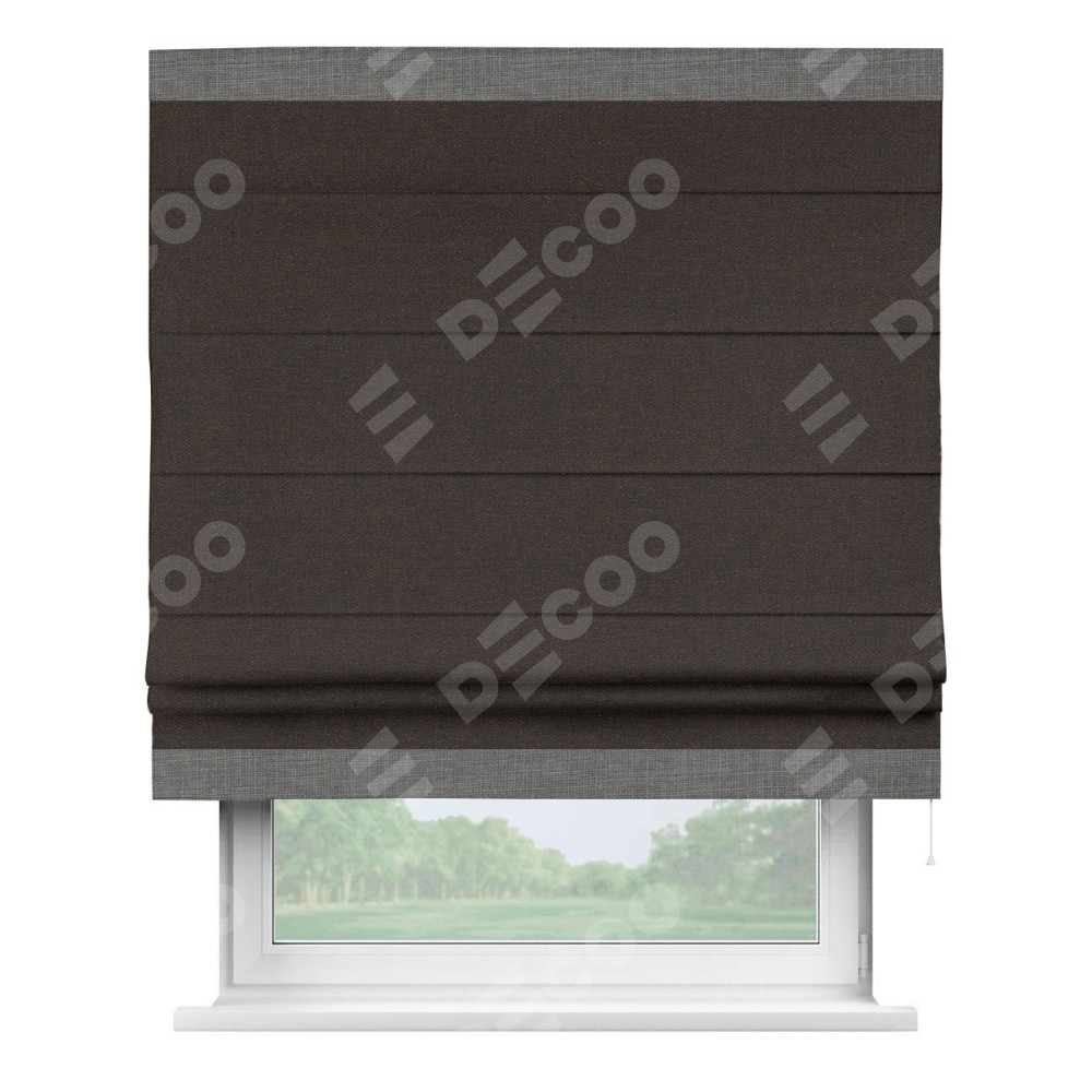 Классическая римская штора производителя «Cortin», пошита из ткани лён тёмно-коричневый, артикул: 104497. Имеет универсальный механизм и подходит для монтажа: на потолок, на стену и в нишу.