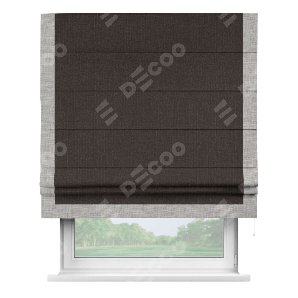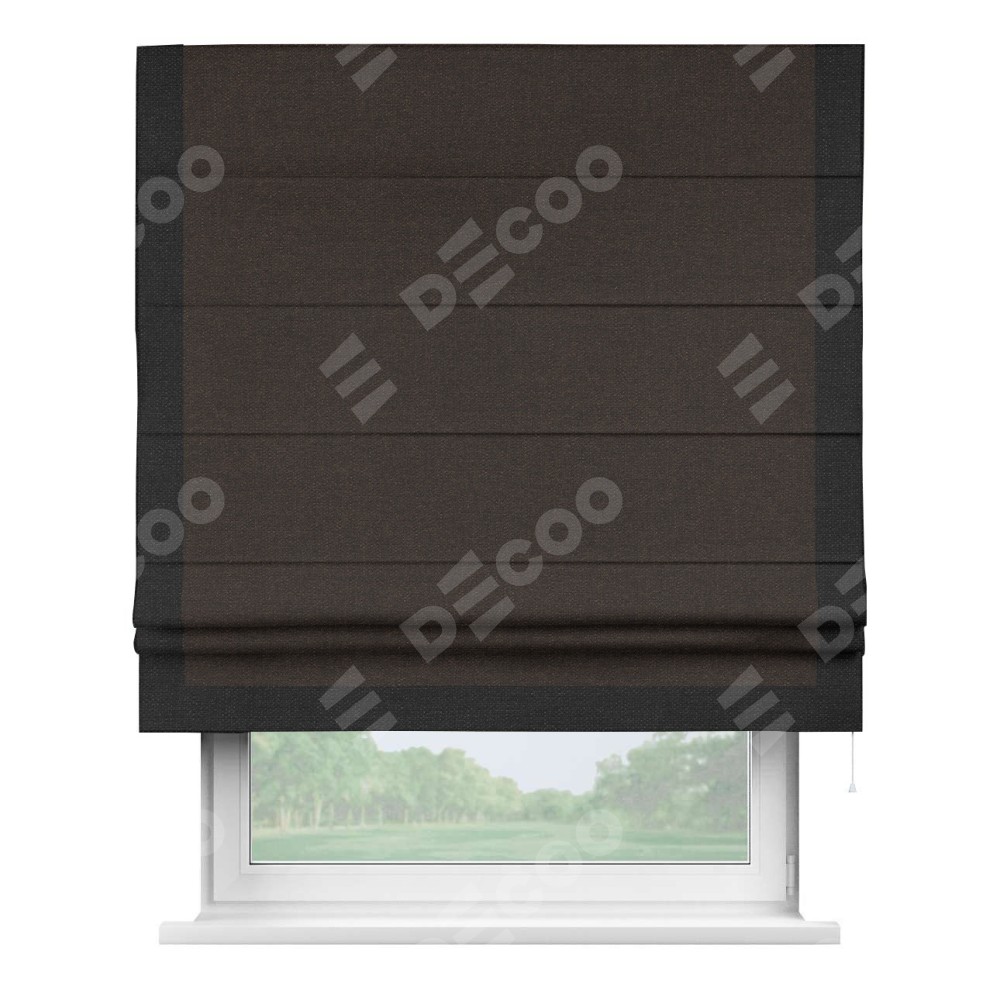 Классическая римская штора производителя «Cortin», пошита из ткани лён тёмно-коричневый, артикул: 104497. Имеет универсальный механизм и подходит для монтажа: на потолок, на стену и в нишу.