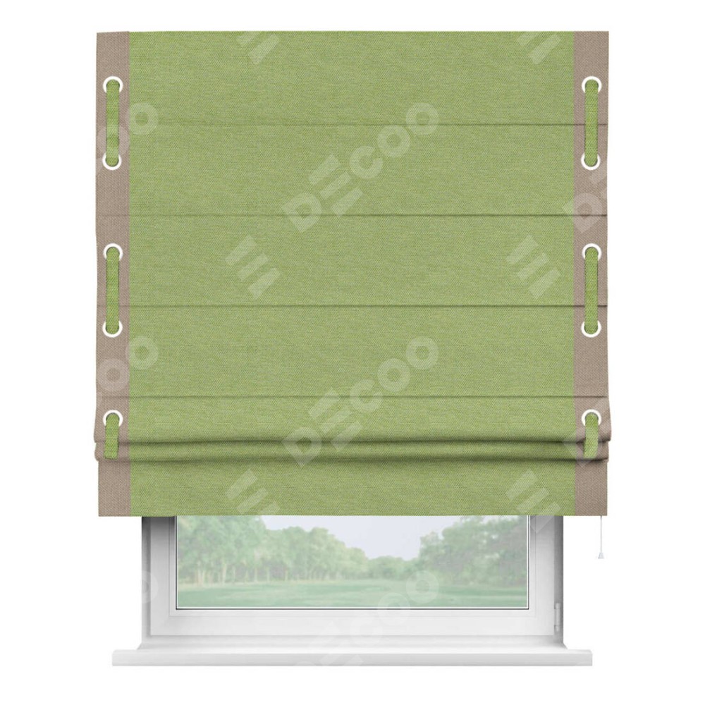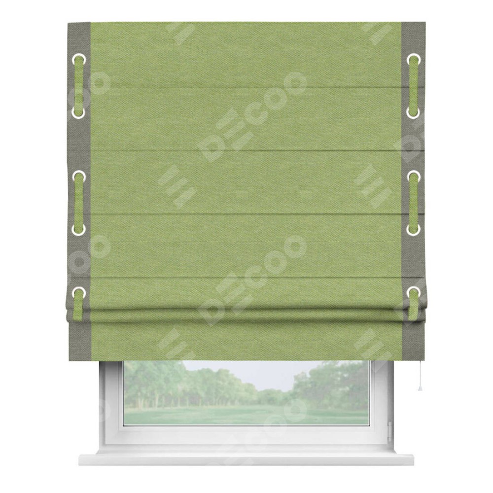 Римская штора производителя «Cortin», используется для проёма, пошита из ткани лён димаут салатовый, артикул 83032. Отделка шторы кантом «Стрим Дуо» на кантах расположены люверсы с пояском, ткань для канта используется лён димаут разной расцветки на выбор. Ткань для пояска обычно используется из основной ткани шторы, а так же можно сделать из любой расцветки по желанию. Имеет универсальный механизм и подходит для монтажа: на потолок, на стену и в нишу.